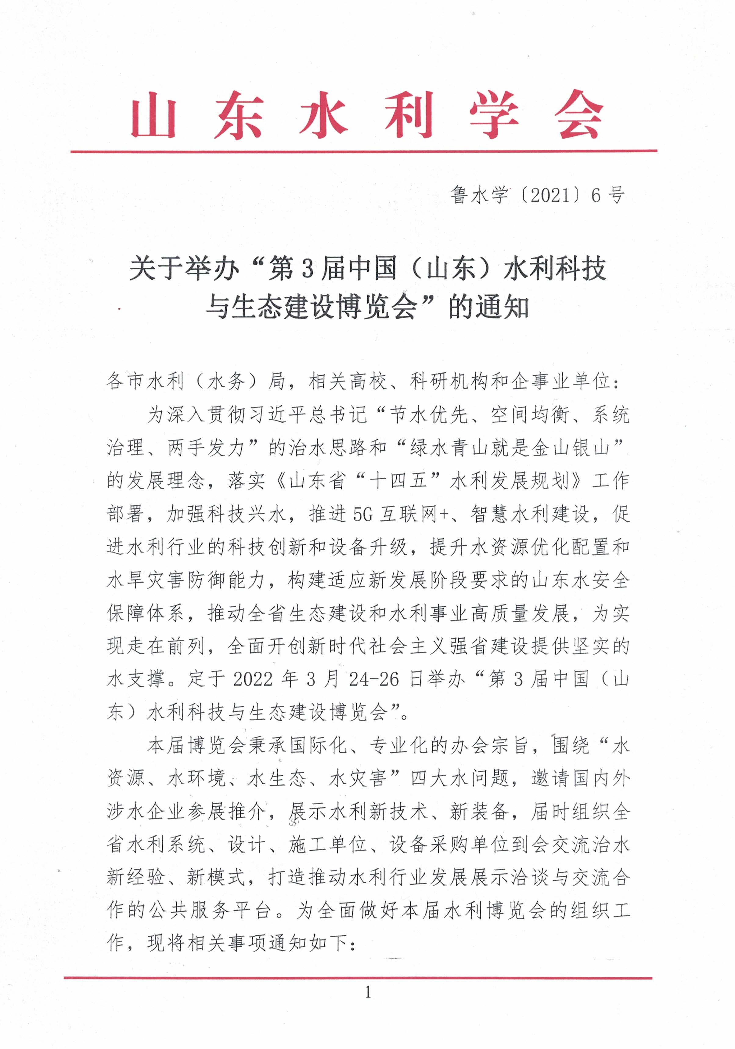 2021年12月6日,山東水利學(xué)會印發(fā)2021年6號文件,第3屆中國(山東)水利科技與生態(tài)建設(shè)博覽會的各項(xiàng)工作正式開始。誠邀各水利與生態(tài)建設(shè)相關(guān)企業(yè)報(bào)名參展,歡迎各水利同仁到會參觀。2022年3月24-26日,“紅瓦綠樹,碧海藍(lán)天”的青島歡迎您!