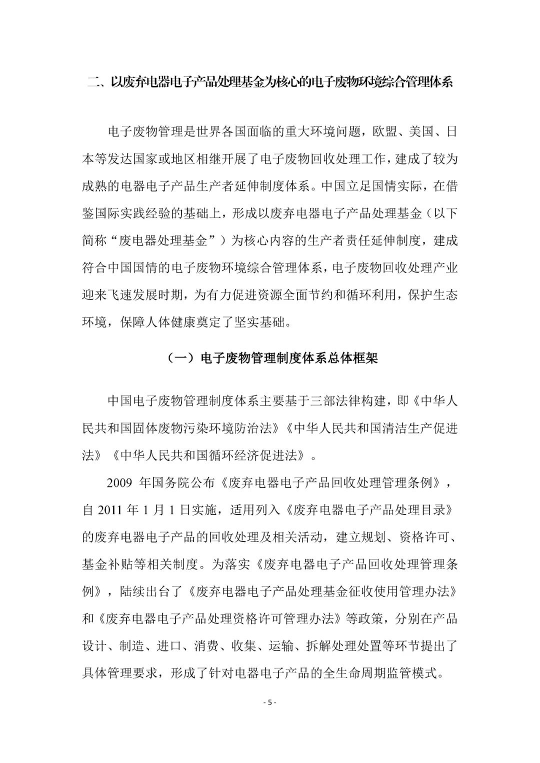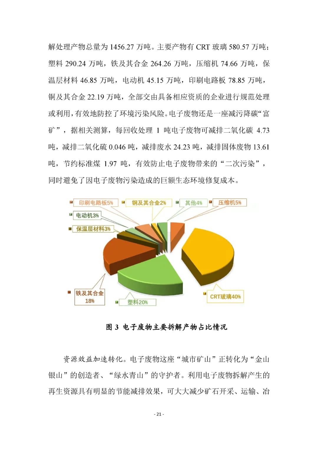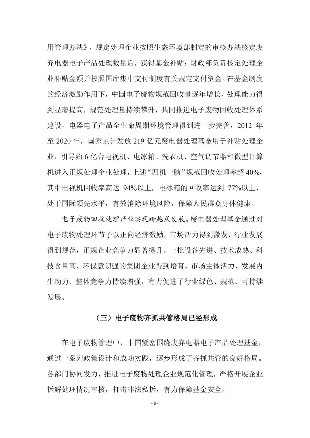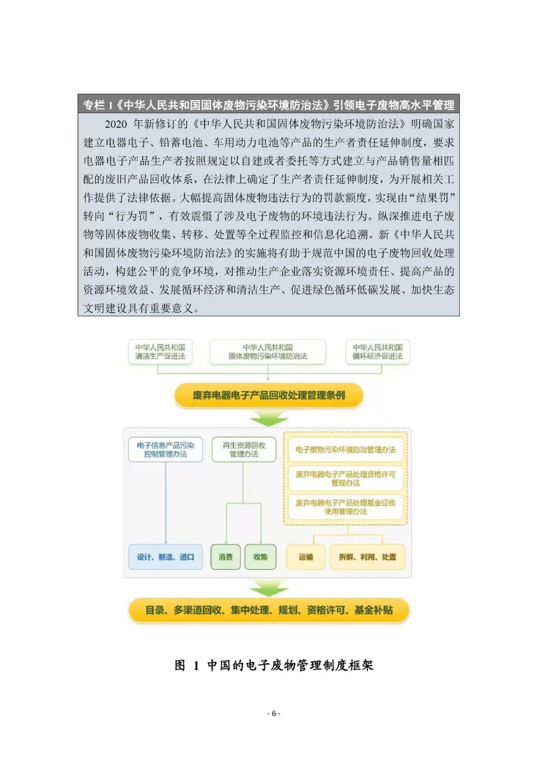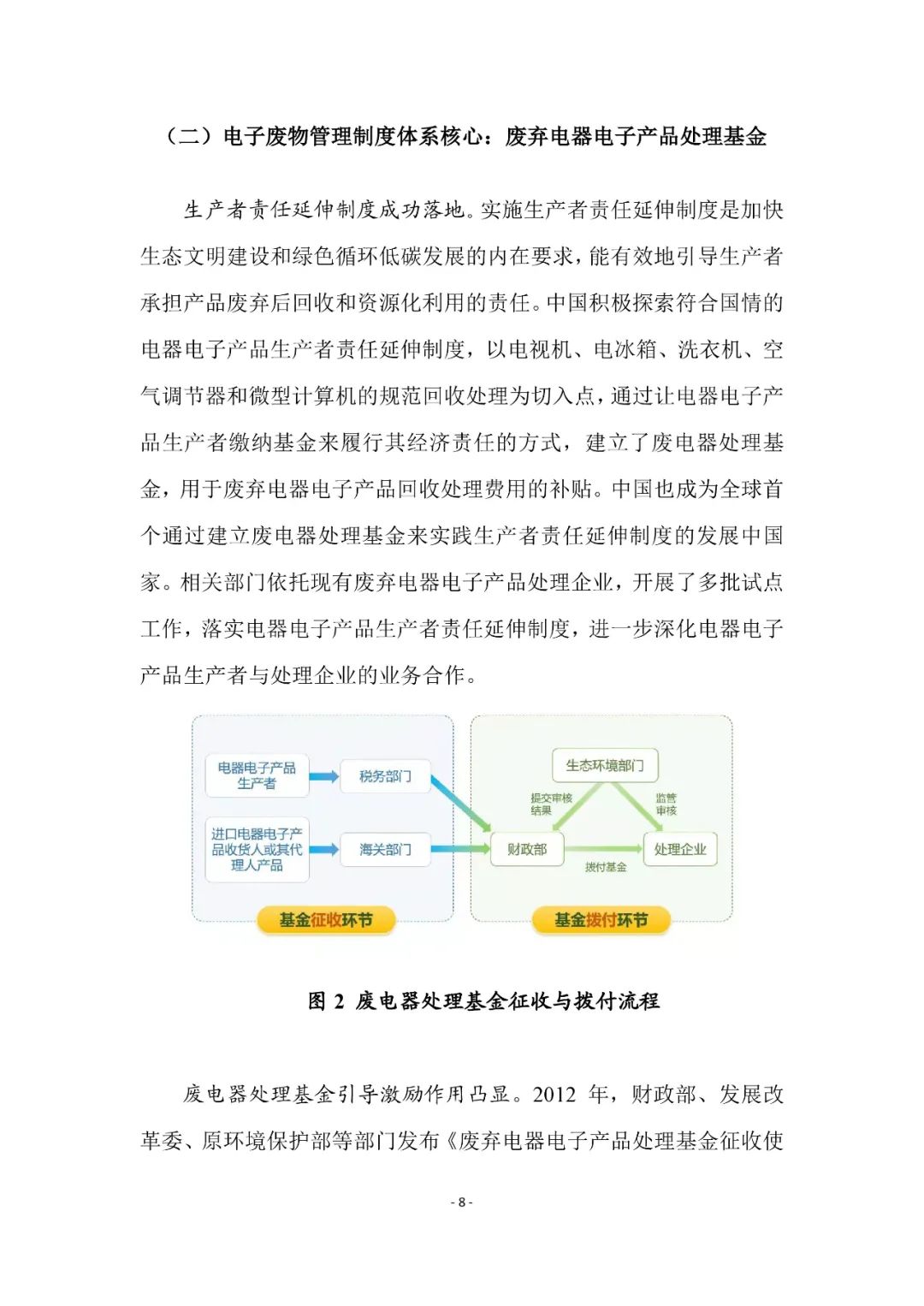 12月23日,生態(tài)環(huán)境部固體廢物與化學(xué)品管理技術(shù)中心發(fā)布《中國(guó)電子廢物環(huán)境綜合管理(2012-2021)》報(bào)告。報(bào)告從四大部分10個(gè)方面對(duì)近10年電子廢物行業(yè)發(fā)展做了系統(tǒng)闡述。近年來(lái),中國(guó)的固體廢物污染防治的法規(guī)制度體系日臻完善,固體廢物源頭減量和資源化利用持續(xù)推進(jìn),固體廢物治理體系和治理能力得到顯著提升,為建設(shè)生態(tài)文明和美麗中國(guó)提供了堅(jiān)強(qiáng)保障,也為其他國(guó)家和地區(qū)提供了中國(guó)經(jīng)驗(yàn)。為全面介紹中國(guó)電子廢物環(huán)境綜合管理理念和實(shí)踐,增進(jìn)國(guó)際社會(huì)對(duì)中國(guó)電子廢物環(huán)境管理的了解,特發(fā)布本報(bào)告。(報(bào)告原文請(qǐng)點(diǎn)擊文末“閱讀原文”下載)一、堅(jiān)定走生態(tài)優(yōu)先綠色低碳發(fā)展道路中國(guó)的電子廢物環(huán)境管理以全面促進(jìn)資源節(jié)約集約利用為目標(biāo),全方位構(gòu)建電子廢物減量化、資源化、無(wú)害化體系,切實(shí)解決老百姓身邊突出的電子廢物污染問(wèn)題,積極適應(yīng)新形勢(shì)新要求,扎實(shí)做好與“碳達(dá)峰、碳中和”等各項(xiàng)工作的對(duì)接融合,促進(jìn)減污降碳協(xié)同增效,加快推動(dòng)生態(tài)文明建設(shè)再上新臺(tái)階、取得新成效。二、建成以廢棄電器電子產(chǎn)品處理基金為核心的電子廢物環(huán)境綜合管理體系電子廢物管理是世界各國(guó)面臨的重大環(huán)境問(wèn)題,中國(guó)立足國(guó)情實(shí)際,在借鑒國(guó)際實(shí)踐經(jīng)驗(yàn)的基礎(chǔ)上,形成了以廢棄電器電子產(chǎn)品處理基金為核心的生產(chǎn)者責(zé)任延伸制度,建成符合中國(guó)國(guó)情的電子廢物環(huán)境綜合管理體系,為促進(jìn)資源全面節(jié)約和循環(huán)利用、保護(hù)生態(tài)環(huán)境、保障人體健康奠定了堅(jiān)實(shí)基礎(chǔ)。(一)中國(guó)電子廢物管理制度框架日臻完善。《中華人民共和國(guó)固體廢物污染環(huán)境防治法》《中華人民共和國(guó)清潔生產(chǎn)促進(jìn)法》《中華人民共和國(guó)循環(huán)經(jīng)濟(jì)促進(jìn)法》是中國(guó)電子廢物管理的法律基礎(chǔ),特別是中國(guó)出臺(tái)《廢棄電器電子產(chǎn)品回收處理管理?xiàng)l例》,并發(fā)布《廢棄電器電子產(chǎn)品處理基金征收使用管理辦法》等配套政策文件,電子廢物環(huán)境管理體系和技術(shù)要求得到進(jìn)一步完善。(二)廢棄電器電子產(chǎn)品處理基金成為電子廢物管理制度體系核心。中國(guó)積極探索符合國(guó)情的電器電子產(chǎn)品生產(chǎn)者責(zé)任延伸制度,通過(guò)讓電器電子產(chǎn)品生產(chǎn)者繳納基金的方式,建立了廢電器處理基金,用于廢棄電器電子產(chǎn)品回收處理費(fèi)用的補(bǔ)貼,成為全球首個(gè)通過(guò)建立廢電器處理基金來(lái)實(shí)踐生產(chǎn)者責(zé)任延伸制度的發(fā)展中國(guó)家。2012年至2020年,中國(guó)累計(jì)發(fā)放219億元廢電器處理基金用于補(bǔ)貼處理企業(yè),引導(dǎo)約6億臺(tái)電視機(jī)、電冰箱、洗衣機(jī)、空氣調(diào)節(jié)器、微型計(jì)算機(jī)進(jìn)入正規(guī)處理企業(yè),其中電視機(jī)回收率高達(dá)94%以上,電冰箱的回收率達(dá)到77%以上,處于國(guó)際領(lǐng)先水平,有效消除了環(huán)境風(fēng)險(xiǎn),保障了人民群眾身體健康。在廢電器處理基金的激勵(lì)下,廢電器處理企業(yè)的發(fā)展內(nèi)生動(dòng)力和整體競(jìng)爭(zhēng)力持續(xù)增強(qiáng),中國(guó)的電子廢物回收處理產(chǎn)業(yè)實(shí)現(xiàn)了跨越式發(fā)展。(三)形成電子廢物齊抓共管工作格局。中國(guó)緊密?chē)@廢棄電器電子產(chǎn)品處理基金制度,通過(guò)一系列政策設(shè)計(jì)和成功實(shí)踐,逐步形成了電子廢物齊抓共管的良好格局。各相關(guān)部門(mén)協(xié)同發(fā)力,管理范圍貫穿電器電子產(chǎn)品生產(chǎn)、流通、回收處理和循環(huán)利用的全生命周期。嚴(yán)格開(kāi)展企業(yè)拆解處理情況審核,打擊非法拆解,有力保障了基金安全。三、促進(jìn)電子廢物處理處置行業(yè)高質(zhì)量發(fā)展中國(guó)的電子廢物處理企業(yè)規(guī)范發(fā)展與環(huán)境質(zhì)量改善同步推進(jìn),顯著降低了有關(guān)生態(tài)環(huán)境風(fēng)險(xiǎn)和職業(yè)健康風(fēng)險(xiǎn),電子廢物規(guī)范回收處理率、技術(shù)研發(fā)、產(chǎn)業(yè)鏈體量、環(huán)境保護(hù)要求等方面加快與國(guó)際一流水平接軌,相關(guān)從業(yè)人員和行業(yè)管理者自信心不斷增強(qiáng),電子廢物處理行業(yè)邁入新的發(fā)展階段。(一)處理企業(yè)主體活力充分激發(fā)釋放。在廢電器處理基金等支持政策的激勵(lì)下,中國(guó)電子廢物產(chǎn)業(yè)發(fā)展活力競(jìng)相迸發(fā),產(chǎn)業(yè)規(guī)模優(yōu)勢(shì)逐漸顯現(xiàn)。正規(guī)處理企業(yè)處理能力由2012年的0.46億臺(tái)/年增長(zhǎng)至2020年的1.64億臺(tái)/年,電子廢物處理企業(yè)年實(shí)際處理量由2012年的1010萬(wàn)臺(tái)增長(zhǎng)至2020年的8498萬(wàn)臺(tái)。中國(guó)的電子廢物處理企業(yè)嚴(yán)格執(zhí)行國(guó)家“以人