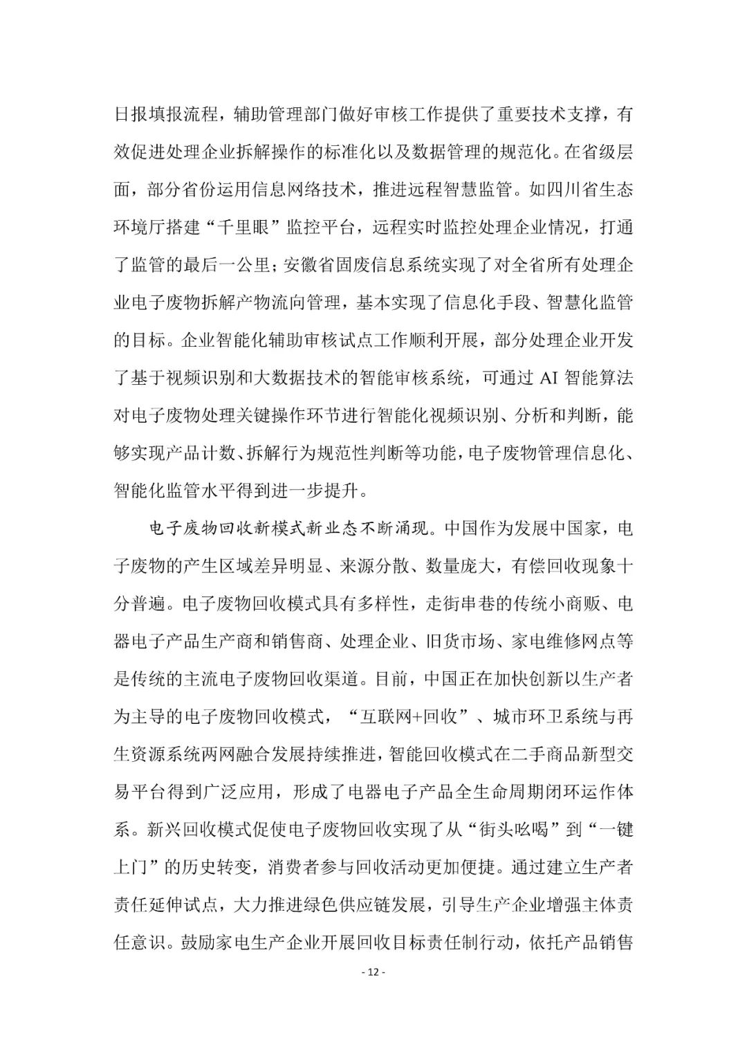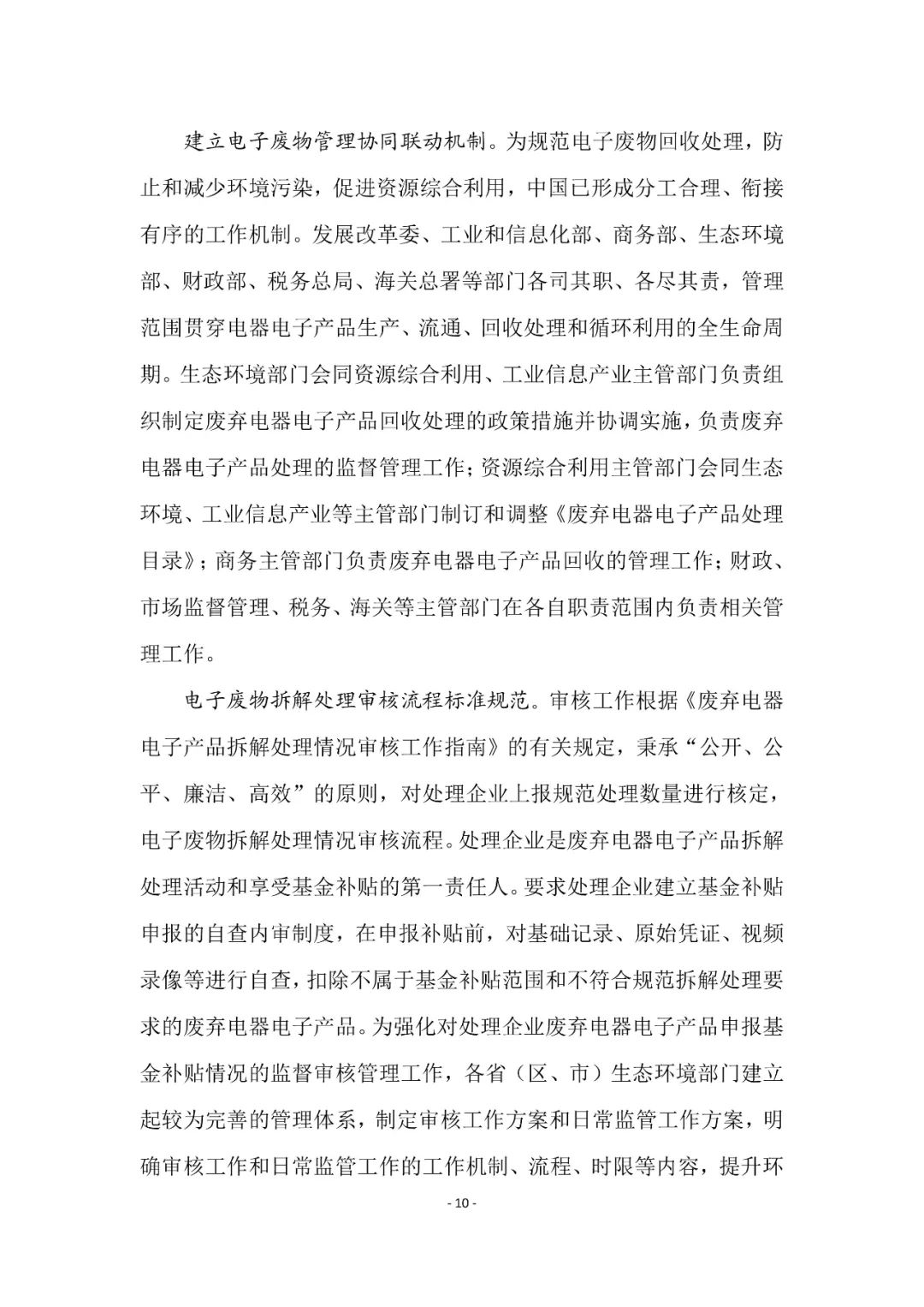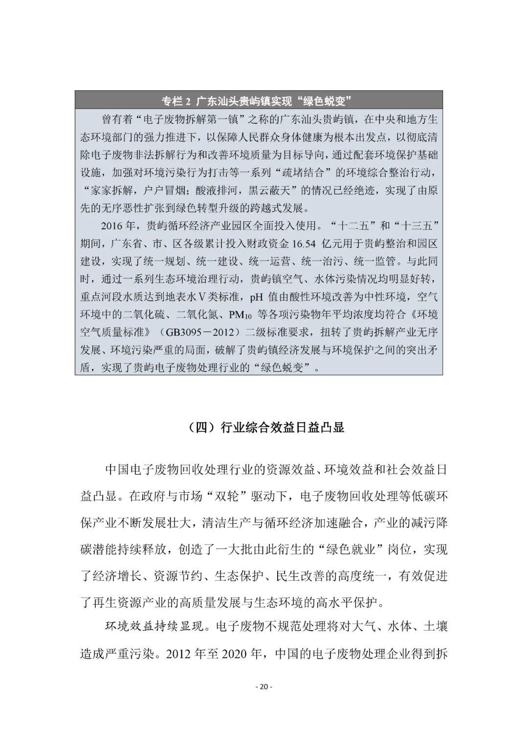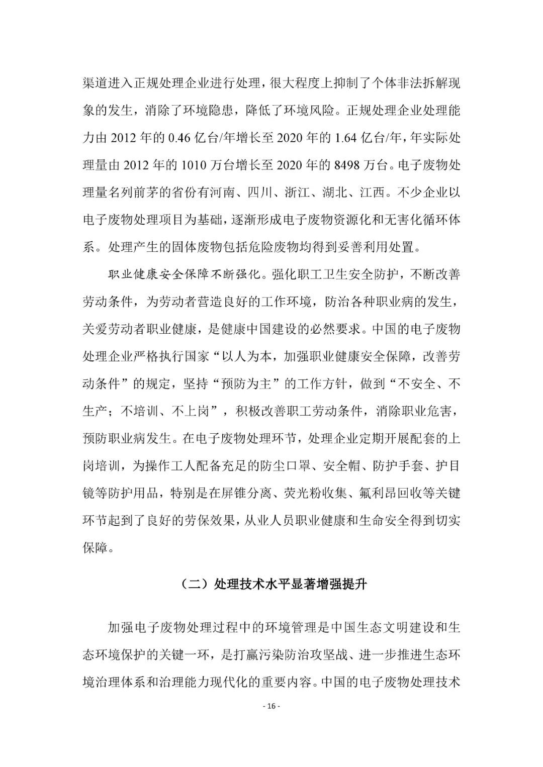 12月23日,生態(tài)環(huán)境部固體廢物與化學(xué)品管理技術(shù)中心發(fā)布《中國(guó)電子廢物環(huán)境綜合管理(2012-2021)》報(bào)告。報(bào)告從四大部分10個(gè)方面對(duì)近10年電子廢物行業(yè)發(fā)展做了系統(tǒng)闡述。近年來(lái),中國(guó)的固體廢物污染防治的法規(guī)制度體系日臻完善,固體廢物源頭減量和資源化利用持續(xù)推進(jìn),固體廢物治理體系和治理能力得到顯著提升,為建設(shè)生態(tài)文明和美麗中國(guó)提供了堅(jiān)強(qiáng)保障,也為其他國(guó)家和地區(qū)提供了中國(guó)經(jīng)驗(yàn)。為全面介紹中國(guó)電子廢物環(huán)境綜合管理理念和實(shí)踐,增進(jìn)國(guó)際社會(huì)對(duì)中國(guó)電子廢物環(huán)境管理的了解,特發(fā)布本報(bào)告。(報(bào)告原文請(qǐng)點(diǎn)擊文末“閱讀原文”下載)一、堅(jiān)定走生態(tài)優(yōu)先綠色低碳發(fā)展道路中國(guó)的電子廢物環(huán)境管理以全面促進(jìn)資源節(jié)約集約利用為目標(biāo),全方位構(gòu)建電子廢物減量化、資源化、無(wú)害化體系,切實(shí)解決老百姓身邊突出的電子廢物污染問(wèn)題,積極適應(yīng)新形勢(shì)新要求,扎實(shí)做好與“碳達(dá)峰、碳中和”等各項(xiàng)工作的對(duì)接融合,促進(jìn)減污降碳協(xié)同增效,加快推動(dòng)生態(tài)文明建設(shè)再上新臺(tái)階、取得新成效。二、建成以廢棄電器電子產(chǎn)品處理基金為核心的電子廢物環(huán)境綜合管理體系電子廢物管理是世界各國(guó)面臨的重大環(huán)境問(wèn)題,中國(guó)立足國(guó)情實(shí)際,在借鑒國(guó)際實(shí)踐經(jīng)驗(yàn)的基礎(chǔ)上,形成了以廢棄電器電子產(chǎn)品處理基金為核心的生產(chǎn)者責(zé)任延伸制度,建成符合中國(guó)國(guó)情的電子廢物環(huán)境綜合管理體系,為促進(jìn)資源全面節(jié)約和循環(huán)利用、保護(hù)生態(tài)環(huán)境、保障人體健康奠定了堅(jiān)實(shí)基礎(chǔ)。(一)中國(guó)電子廢物管理制度框架日臻完善。《中華人民共和國(guó)固體廢物污染環(huán)境防治法》《中華人民共和國(guó)清潔生產(chǎn)促進(jìn)法》《中華人民共和國(guó)循環(huán)經(jīng)濟(jì)促進(jìn)法》是中國(guó)電子廢物管理的法律基礎(chǔ),特別是中國(guó)出臺(tái)《廢棄電器電子產(chǎn)品回收處理管理?xiàng)l例》,并發(fā)布《廢棄電器電子產(chǎn)品處理基金征收使用管理辦法》等配套政策文件,電子廢物環(huán)境管理體系和技術(shù)要求得到進(jìn)一步完善。(二)廢棄電器電子產(chǎn)品處理基金成為電子廢物管理制度體系核心。中國(guó)積極探索符合國(guó)情的電器電子產(chǎn)品生產(chǎn)者責(zé)任延伸制度,通過(guò)讓電器電子產(chǎn)品生產(chǎn)者繳納基金的方式,建立了廢電器處理基金,用于廢棄電器電子產(chǎn)品回收處理費(fèi)用的補(bǔ)貼,成為全球首個(gè)通過(guò)建立廢電器處理基金來(lái)實(shí)踐生產(chǎn)者責(zé)任延伸制度的發(fā)展中國(guó)家。2012年至2020年,中國(guó)累計(jì)發(fā)放219億元廢電器處理基金用于補(bǔ)貼處理企業(yè),引導(dǎo)約6億臺(tái)電視機(jī)、電冰箱、洗衣機(jī)、空氣調(diào)節(jié)器、微型計(jì)算機(jī)進(jìn)入正規(guī)處理企業(yè),其中電視機(jī)回收率高達(dá)94%以上,電冰箱的回收率達(dá)到77%以上,處于國(guó)際領(lǐng)先水平,有效消除了環(huán)境風(fēng)險(xiǎn),保障了人民群眾身體健康。在廢電器處理基金的激勵(lì)下,廢電器處理企業(yè)的發(fā)展內(nèi)生動(dòng)力和整體競(jìng)爭(zhēng)力持續(xù)增強(qiáng),中國(guó)的電子廢物回收處理產(chǎn)業(yè)實(shí)現(xiàn)了跨越式發(fā)展。(三)形成電子廢物齊抓共管工作格局。中國(guó)緊密?chē)@廢棄電器電子產(chǎn)品處理基金制度,通過(guò)一系列政策設(shè)計(jì)和成功實(shí)踐,逐步形成了電子廢物齊抓共管的良好格局。各相關(guān)部門(mén)協(xié)同發(fā)力,管理范圍貫穿電器電子產(chǎn)品生產(chǎn)、流通、回收處理和循環(huán)利用的全生命周期。嚴(yán)格開(kāi)展企業(yè)拆解處理情況審核,打擊非法拆解,有力保障了基金安全。三、促進(jìn)電子廢物處理處置行業(yè)高質(zhì)量發(fā)展中國(guó)的電子廢物處理企業(yè)規(guī)范發(fā)展與環(huán)境質(zhì)量改善同步推進(jìn),顯著降低了有關(guān)生態(tài)環(huán)境風(fēng)險(xiǎn)和職業(yè)健康風(fēng)險(xiǎn),電子廢物規(guī)范回收處理率、技術(shù)研發(fā)、產(chǎn)業(yè)鏈體量、環(huán)境保護(hù)要求等方面加快與國(guó)際一流水平接軌,相關(guān)從業(yè)人員和行業(yè)管理者自信心不斷增強(qiáng),電子廢物處理行業(yè)邁入新的發(fā)展階段。(一)處理企業(yè)主體活力充分激發(fā)釋放。在廢電器處理基金等支持政策的激勵(lì)下,中國(guó)電子廢物產(chǎn)業(yè)發(fā)展活力競(jìng)相迸發(fā),產(chǎn)業(yè)規(guī)模優(yōu)勢(shì)逐漸顯現(xiàn)。正規(guī)處理企業(yè)處理能力由2012年的0.46億臺(tái)/年增長(zhǎng)至2020年的1.64億臺(tái)/年,電子廢物處理企業(yè)年實(shí)際處理量由2012年的1010萬(wàn)臺(tái)增長(zhǎng)至2020年的8498萬(wàn)臺(tái)。中國(guó)的電子廢物處理企業(yè)嚴(yán)格執(zhí)行國(guó)家“以人