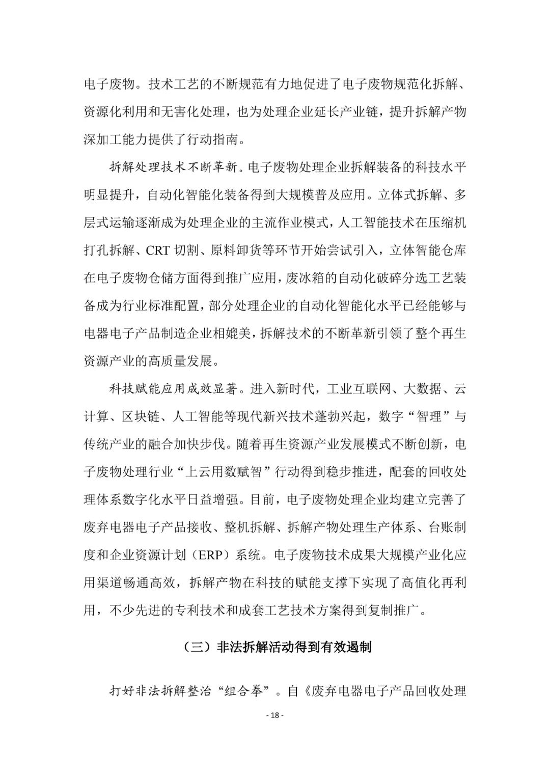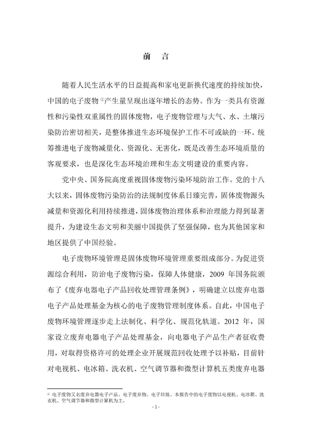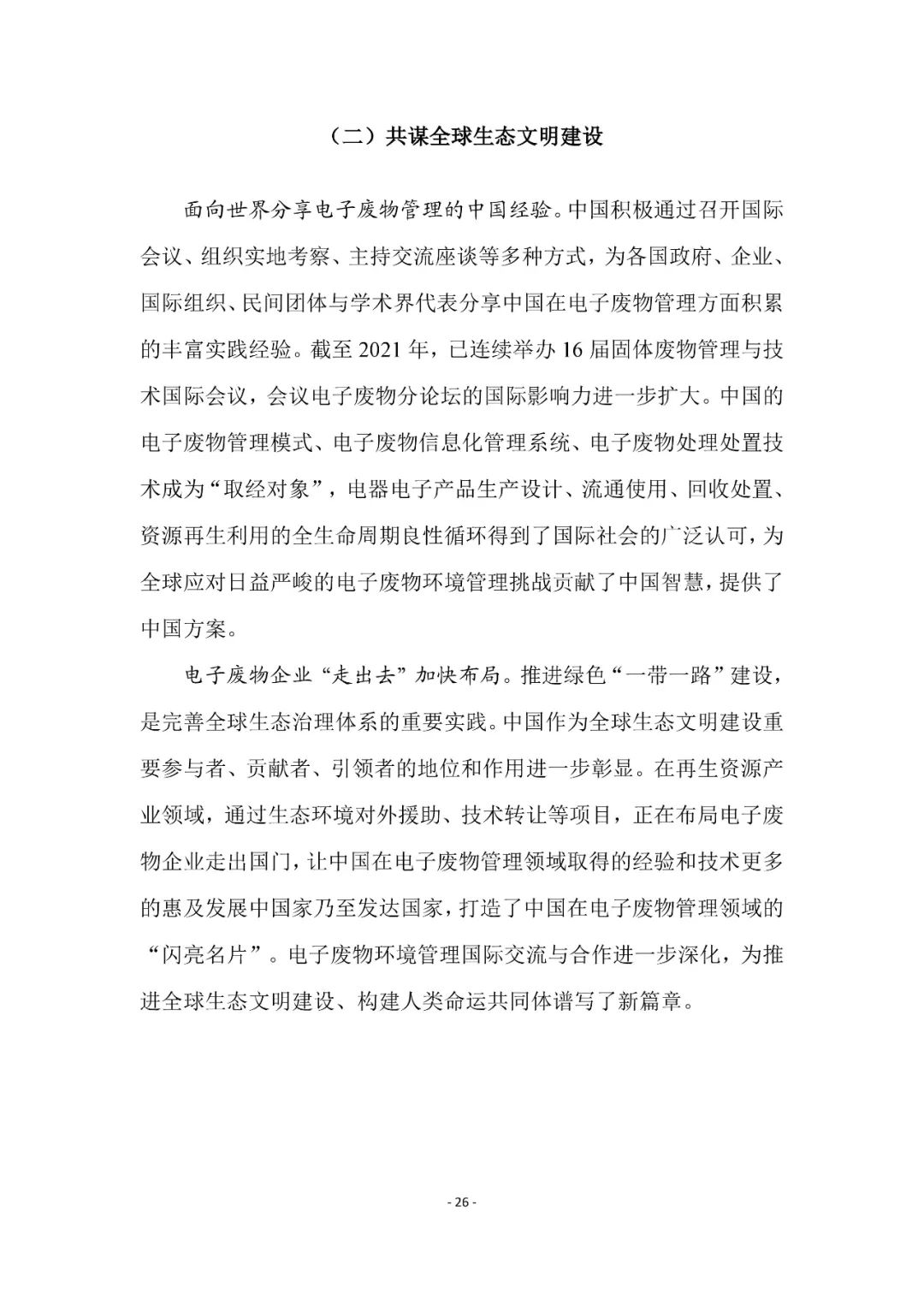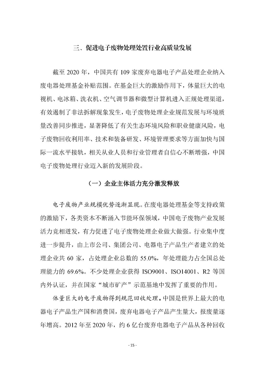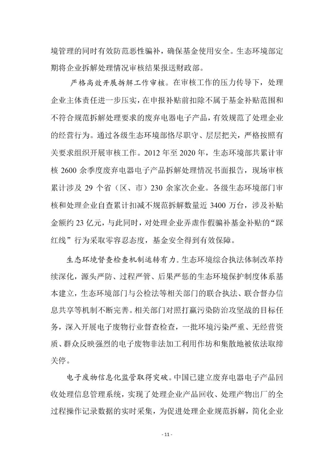 12月23日,生態(tài)環(huán)境部固體廢物與化學(xué)品管理技術(shù)中心發(fā)布《中國(guó)電子廢物環(huán)境綜合管理(2012-2021)》報(bào)告。報(bào)告從四大部分10個(gè)方面對(duì)近10年電子廢物行業(yè)發(fā)展做了系統(tǒng)闡述。近年來(lái),中國(guó)的固體廢物污染防治的法規(guī)制度體系日臻完善,固體廢物源頭減量和資源化利用持續(xù)推進(jìn),固體廢物治理體系和治理能力得到顯著提升,為建設(shè)生態(tài)文明和美麗中國(guó)提供了堅(jiān)強(qiáng)保障,也為其他國(guó)家和地區(qū)提供了中國(guó)經(jīng)驗(yàn)。為全面介紹中國(guó)電子廢物環(huán)境綜合管理理念和實(shí)踐,增進(jìn)國(guó)際社會(huì)對(duì)中國(guó)電子廢物環(huán)境管理的了解,特發(fā)布本報(bào)告。(報(bào)告原文請(qǐng)點(diǎn)擊文末“閱讀原文”下載)一、堅(jiān)定走生態(tài)優(yōu)先綠色低碳發(fā)展道路中國(guó)的電子廢物環(huán)境管理以全面促進(jìn)資源節(jié)約集約利用為目標(biāo),全方位構(gòu)建電子廢物減量化、資源化、無(wú)害化體系,切實(shí)解決老百姓身邊突出的電子廢物污染問(wèn)題,積極適應(yīng)新形勢(shì)新要求,扎實(shí)做好與“碳達(dá)峰、碳中和”等各項(xiàng)工作的對(duì)接融合,促進(jìn)減污降碳協(xié)同增效,加快推動(dòng)生態(tài)文明建設(shè)再上新臺(tái)階、取得新成效。二、建成以廢棄電器電子產(chǎn)品處理基金為核心的電子廢物環(huán)境綜合管理體系電子廢物管理是世界各國(guó)面臨的重大環(huán)境問(wèn)題,中國(guó)立足國(guó)情實(shí)際,在借鑒國(guó)際實(shí)踐經(jīng)驗(yàn)的基礎(chǔ)上,形成了以廢棄電器電子產(chǎn)品處理基金為核心的生產(chǎn)者責(zé)任延伸制度,建成符合中國(guó)國(guó)情的電子廢物環(huán)境綜合管理體系,為促進(jìn)資源全面節(jié)約和循環(huán)利用、保護(hù)生態(tài)環(huán)境、保障人體健康奠定了堅(jiān)實(shí)基礎(chǔ)。(一)中國(guó)電子廢物管理制度框架日臻完善。《中華人民共和國(guó)固體廢物污染環(huán)境防治法》《中華人民共和國(guó)清潔生產(chǎn)促進(jìn)法》《中華人民共和國(guó)循環(huán)經(jīng)濟(jì)促進(jìn)法》是中國(guó)電子廢物管理的法律基礎(chǔ),特別是中國(guó)出臺(tái)《廢棄電器電子產(chǎn)品回收處理管理?xiàng)l例》,并發(fā)布《廢棄電器電子產(chǎn)品處理基金征收使用管理辦法》等配套政策文件,電子廢物環(huán)境管理體系和技術(shù)要求得到進(jìn)一步完善。(二)廢棄電器電子產(chǎn)品處理基金成為電子廢物管理制度體系核心。中國(guó)積極探索符合國(guó)情的電器電子產(chǎn)品生產(chǎn)者責(zé)任延伸制度,通過(guò)讓電器電子產(chǎn)品生產(chǎn)者繳納基金的方式,建立了廢電器處理基金,用于廢棄電器電子產(chǎn)品回收處理費(fèi)用的補(bǔ)貼,成為全球首個(gè)通過(guò)建立廢電器處理基金來(lái)實(shí)踐生產(chǎn)者責(zé)任延伸制度的發(fā)展中國(guó)家。2012年至2020年,中國(guó)累計(jì)發(fā)放219億元廢電器處理基金用于補(bǔ)貼處理企業(yè),引導(dǎo)約6億臺(tái)電視機(jī)、電冰箱、洗衣機(jī)、空氣調(diào)節(jié)器、微型計(jì)算機(jī)進(jìn)入正規(guī)處理企業(yè),其中電視機(jī)回收率高達(dá)94%以上,電冰箱的回收率達(dá)到77%以上,處于國(guó)際領(lǐng)先水平,有效消除了環(huán)境風(fēng)險(xiǎn),保障了人民群眾身體健康。在廢電器處理基金的激勵(lì)下,廢電器處理企業(yè)的發(fā)展內(nèi)生動(dòng)力和整體競(jìng)爭(zhēng)力持續(xù)增強(qiáng),中國(guó)的電子廢物回收處理產(chǎn)業(yè)實(shí)現(xiàn)了跨越式發(fā)展。(三)形成電子廢物齊抓共管工作格局。中國(guó)緊密?chē)@廢棄電器電子產(chǎn)品處理基金制度,通過(guò)一系列政策設(shè)計(jì)和成功實(shí)踐,逐步形成了電子廢物齊抓共管的良好格局。各相關(guān)部門(mén)協(xié)同發(fā)力,管理范圍貫穿電器電子產(chǎn)品生產(chǎn)、流通、回收處理和循環(huán)利用的全生命周期。嚴(yán)格開(kāi)展企業(yè)拆解處理情況審核,打擊非法拆解,有力保障了基金安全。三、促進(jìn)電子廢物處理處置行業(yè)高質(zhì)量發(fā)展中國(guó)的電子廢物處理企業(yè)規(guī)范發(fā)展與環(huán)境質(zhì)量改善同步推進(jìn),顯著降低了有關(guān)生態(tài)環(huán)境風(fēng)險(xiǎn)和職業(yè)健康風(fēng)險(xiǎn),電子廢物規(guī)范回收處理率、技術(shù)研發(fā)、產(chǎn)業(yè)鏈體量、環(huán)境保護(hù)要求等方面加快與國(guó)際一流水平接軌,相關(guān)從業(yè)人員和行業(yè)管理者自信心不斷增強(qiáng),電子廢物處理行業(yè)邁入新的發(fā)展階段。(一)處理企業(yè)主體活力充分激發(fā)釋放。在廢電器處理基金等支持政策的激勵(lì)下,中國(guó)電子廢物產(chǎn)業(yè)發(fā)展活力競(jìng)相迸發(fā),產(chǎn)業(yè)規(guī)模優(yōu)勢(shì)逐漸顯現(xiàn)。正規(guī)處理企業(yè)處理能力由2012年的0.46億臺(tái)/年增長(zhǎng)至2020年的1.64億臺(tái)/年,電子廢物處理企業(yè)年實(shí)際處理量由2012年的1010萬(wàn)臺(tái)增長(zhǎng)至2020年的8498萬(wàn)臺(tái)。中國(guó)的電子廢物處理企業(yè)嚴(yán)格執(zhí)行國(guó)家“以人