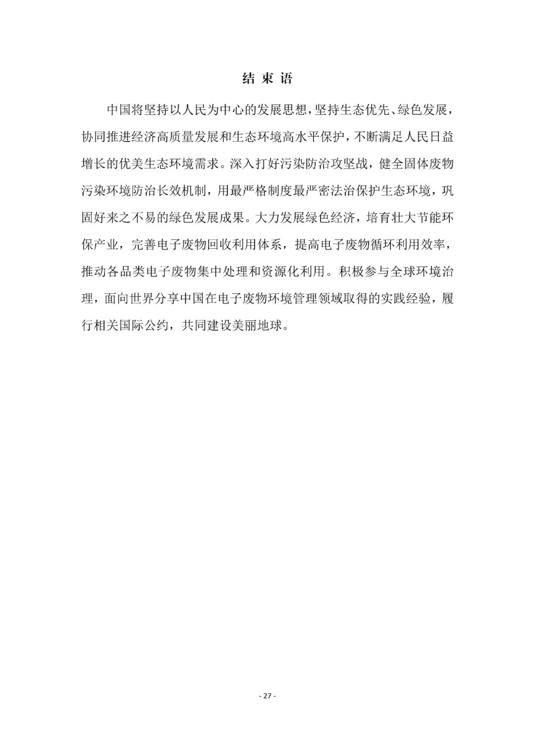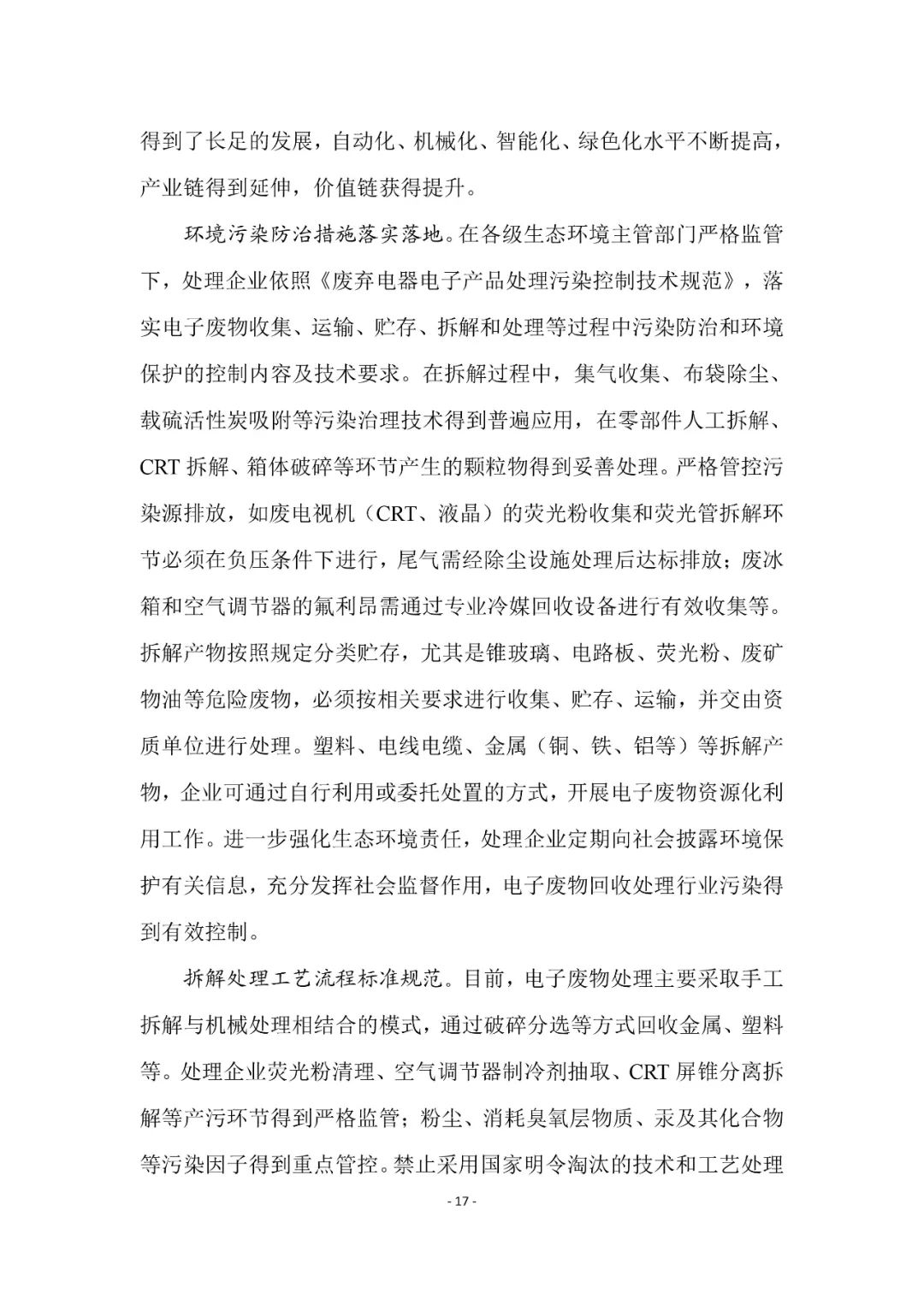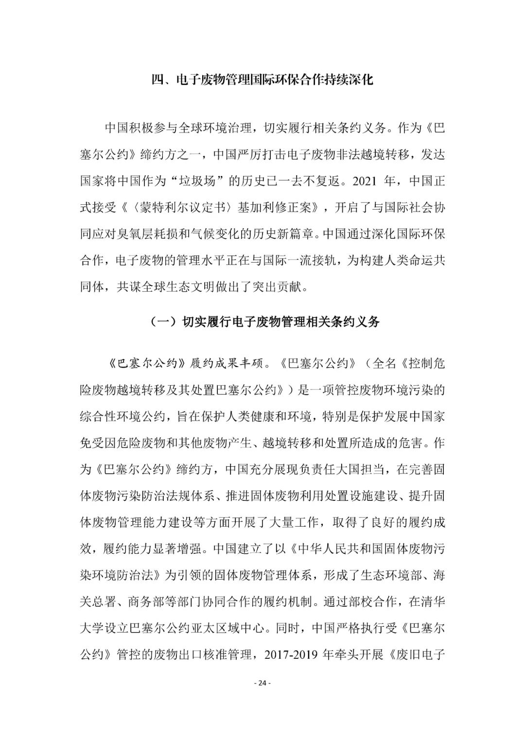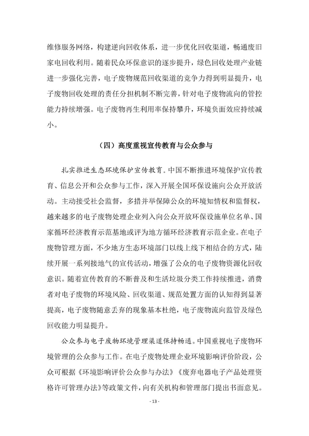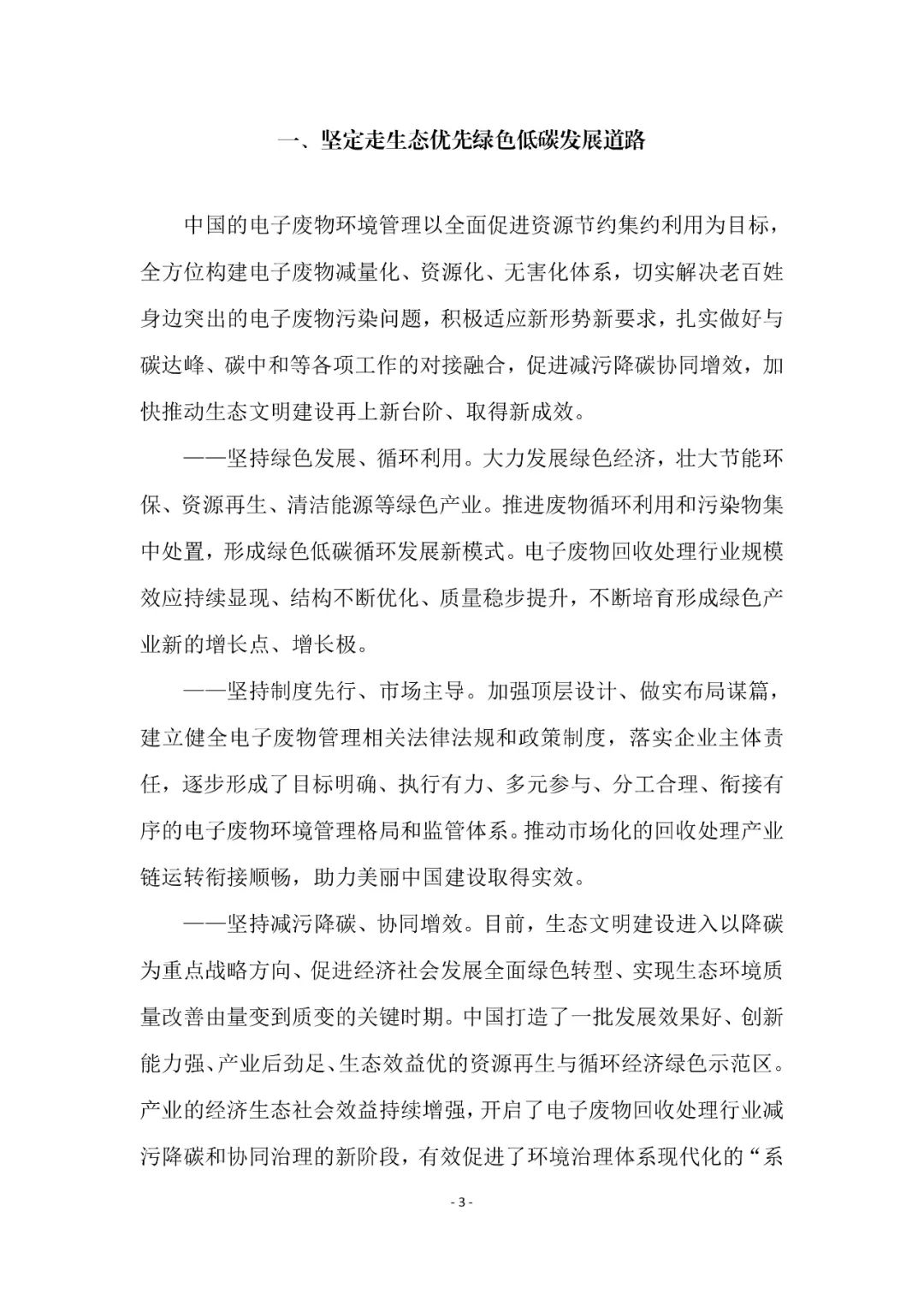 12月23日,生態(tài)環(huán)境部固體廢物與化學(xué)品管理技術(shù)中心發(fā)布《中國(guó)電子廢物環(huán)境綜合管理(2012-2021)》報(bào)告。報(bào)告從四大部分10個(gè)方面對(duì)近10年電子廢物行業(yè)發(fā)展做了系統(tǒng)闡述。近年來(lái),中國(guó)的固體廢物污染防治的法規(guī)制度體系日臻完善,固體廢物源頭減量和資源化利用持續(xù)推進(jìn),固體廢物治理體系和治理能力得到顯著提升,為建設(shè)生態(tài)文明和美麗中國(guó)提供了堅(jiān)強(qiáng)保障,也為其他國(guó)家和地區(qū)提供了中國(guó)經(jīng)驗(yàn)。為全面介紹中國(guó)電子廢物環(huán)境綜合管理理念和實(shí)踐,增進(jìn)國(guó)際社會(huì)對(duì)中國(guó)電子廢物環(huán)境管理的了解,特發(fā)布本報(bào)告。(報(bào)告原文請(qǐng)點(diǎn)擊文末“閱讀原文”下載)一、堅(jiān)定走生態(tài)優(yōu)先綠色低碳發(fā)展道路中國(guó)的電子廢物環(huán)境管理以全面促進(jìn)資源節(jié)約集約利用為目標(biāo),全方位構(gòu)建電子廢物減量化、資源化、無(wú)害化體系,切實(shí)解決老百姓身邊突出的電子廢物污染問(wèn)題,積極適應(yīng)新形勢(shì)新要求,扎實(shí)做好與“碳達(dá)峰、碳中和”等各項(xiàng)工作的對(duì)接融合,促進(jìn)減污降碳協(xié)同增效,加快推動(dòng)生態(tài)文明建設(shè)再上新臺(tái)階、取得新成效。二、建成以廢棄電器電子產(chǎn)品處理基金為核心的電子廢物環(huán)境綜合管理體系電子廢物管理是世界各國(guó)面臨的重大環(huán)境問(wèn)題,中國(guó)立足國(guó)情實(shí)際,在借鑒國(guó)際實(shí)踐經(jīng)驗(yàn)的基礎(chǔ)上,形成了以廢棄電器電子產(chǎn)品處理基金為核心的生產(chǎn)者責(zé)任延伸制度,建成符合中國(guó)國(guó)情的電子廢物環(huán)境綜合管理體系,為促進(jìn)資源全面節(jié)約和循環(huán)利用、保護(hù)生態(tài)環(huán)境、保障人體健康奠定了堅(jiān)實(shí)基礎(chǔ)。(一)中國(guó)電子廢物管理制度框架日臻完善。《中華人民共和國(guó)固體廢物污染環(huán)境防治法》《中華人民共和國(guó)清潔生產(chǎn)促進(jìn)法》《中華人民共和國(guó)循環(huán)經(jīng)濟(jì)促進(jìn)法》是中國(guó)電子廢物管理的法律基礎(chǔ),特別是中國(guó)出臺(tái)《廢棄電器電子產(chǎn)品回收處理管理?xiàng)l例》,并發(fā)布《廢棄電器電子產(chǎn)品處理基金征收使用管理辦法》等配套政策文件,電子廢物環(huán)境管理體系和技術(shù)要求得到進(jìn)一步完善。(二)廢棄電器電子產(chǎn)品處理基金成為電子廢物管理制度體系核心。中國(guó)積極探索符合國(guó)情的電器電子產(chǎn)品生產(chǎn)者責(zé)任延伸制度,通過(guò)讓電器電子產(chǎn)品生產(chǎn)者繳納基金的方式,建立了廢電器處理基金,用于廢棄電器電子產(chǎn)品回收處理費(fèi)用的補(bǔ)貼,成為全球首個(gè)通過(guò)建立廢電器處理基金來(lái)實(shí)踐生產(chǎn)者責(zé)任延伸制度的發(fā)展中國(guó)家。2012年至2020年,中國(guó)累計(jì)發(fā)放219億元廢電器處理基金用于補(bǔ)貼處理企業(yè),引導(dǎo)約6億臺(tái)電視機(jī)、電冰箱、洗衣機(jī)、空氣調(diào)節(jié)器、微型計(jì)算機(jī)進(jìn)入正規(guī)處理企業(yè),其中電視機(jī)回收率高達(dá)94%以上,電冰箱的回收率達(dá)到77%以上,處于國(guó)際領(lǐng)先水平,有效消除了環(huán)境風(fēng)險(xiǎn),保障了人民群眾身體健康。在廢電器處理基金的激勵(lì)下,廢電器處理企業(yè)的發(fā)展內(nèi)生動(dòng)力和整體競(jìng)爭(zhēng)力持續(xù)增強(qiáng),中國(guó)的電子廢物回收處理產(chǎn)業(yè)實(shí)現(xiàn)了跨越式發(fā)展。(三)形成電子廢物齊抓共管工作格局。中國(guó)緊密?chē)@廢棄電器電子產(chǎn)品處理基金制度,通過(guò)一系列政策設(shè)計(jì)和成功實(shí)踐,逐步形成了電子廢物齊抓共管的良好格局。各相關(guān)部門(mén)協(xié)同發(fā)力,管理范圍貫穿電器電子產(chǎn)品生產(chǎn)、流通、回收處理和循環(huán)利用的全生命周期。嚴(yán)格開(kāi)展企業(yè)拆解處理情況審核,打擊非法拆解,有力保障了基金安全。三、促進(jìn)電子廢物處理處置行業(yè)高質(zhì)量發(fā)展中國(guó)的電子廢物處理企業(yè)規(guī)范發(fā)展與環(huán)境質(zhì)量改善同步推進(jìn),顯著降低了有關(guān)生態(tài)環(huán)境風(fēng)險(xiǎn)和職業(yè)健康風(fēng)險(xiǎn),電子廢物規(guī)范回收處理率、技術(shù)研發(fā)、產(chǎn)業(yè)鏈體量、環(huán)境保護(hù)要求等方面加快與國(guó)際一流水平接軌,相關(guān)從業(yè)人員和行業(yè)管理者自信心不斷增強(qiáng),電子廢物處理行業(yè)邁入新的發(fā)展階段。(一)處理企業(yè)主體活力充分激發(fā)釋放。在廢電器處理基金等支持政策的激勵(lì)下,中國(guó)電子廢物產(chǎn)業(yè)發(fā)展活力競(jìng)相迸發(fā),產(chǎn)業(yè)規(guī)模優(yōu)勢(shì)逐漸顯現(xiàn)。正規(guī)處理企業(yè)處理能力由2012年的0.46億臺(tái)/年增長(zhǎng)至2020年的1.64億臺(tái)/年,電子廢物處理企業(yè)年實(shí)際處理量由2012年的1010萬(wàn)臺(tái)增長(zhǎng)至2020年的8498萬(wàn)臺(tái)。中國(guó)的電子廢物處理企業(yè)嚴(yán)格執(zhí)行國(guó)家“以人
