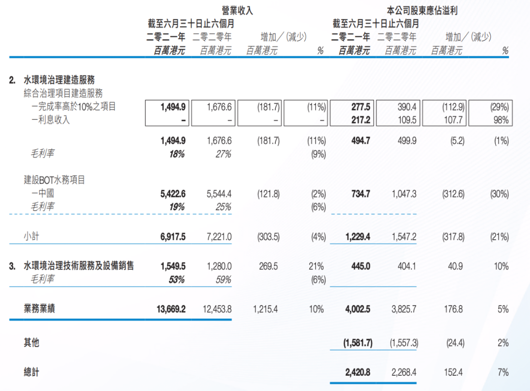 2021年上半年,北控水務(wù)實(shí)現(xiàn)營收136.69億港元,同比增9.8%;公司實(shí)現(xiàn)收益40.32億元人民幣,同比增83%;股東應(yīng)占溢利24.21億港元,同比增7%;