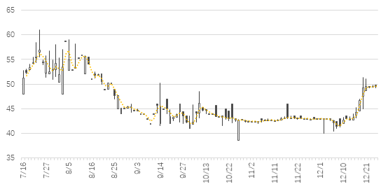 價格方面,截至12月24日,全國碳市場掛牌協(xié)議交易平均價格約45.9元/噸,最高價61.07元/噸,最低價38.5元/噸,絕大部分在40到60區(qū)間內(nèi)波動,總體呈現(xiàn)波動降低的趨勢,12月以來隨著履約期臨近,碳價開始逐步升高,從12月初的約42元/噸回升到50元/噸左右,12月21日大宗交易也出現(xiàn)了46.3元/噸的較高交易價格。氣候投融資試點工作將著力探索支持全國碳市場長期平穩(wěn)運行的相應(yīng)手段,推動碳市場提供更穩(wěn)定的長期價格信號,促進(jìn)減排活動的實施效率,同時也挖掘碳配額的價值,為企業(yè)減排活動提供更全面的支持。