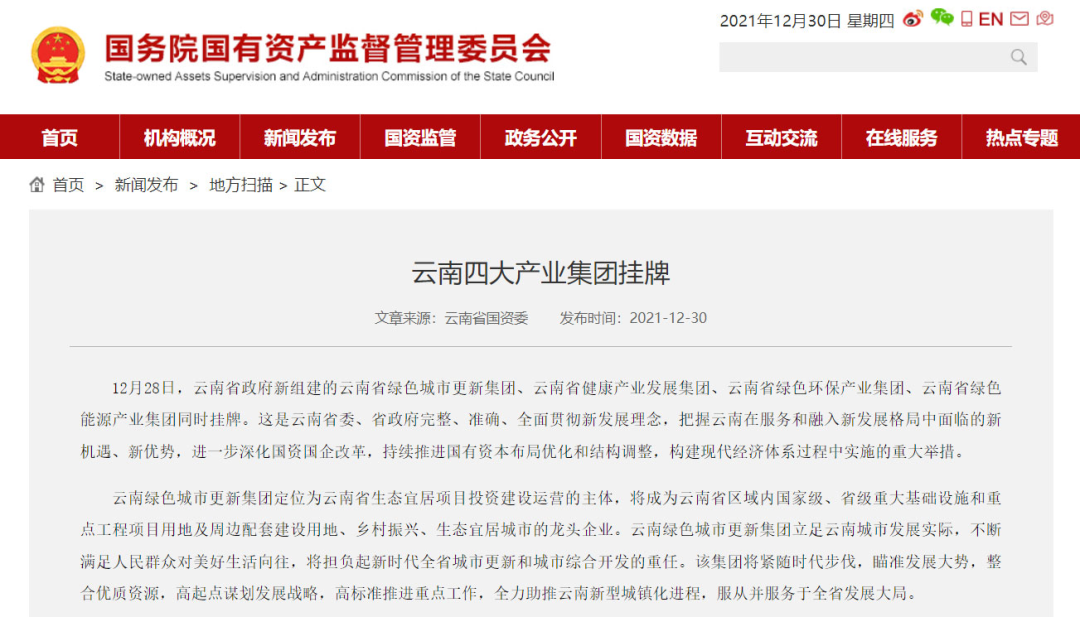 1、云南四大產業(yè)集團掛牌,云南省國資委,2021-12-30
