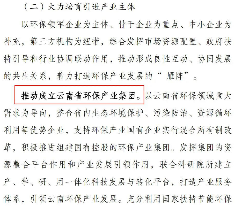 年底之前,總有大事發(fā)生。去年底是康恒、博世科、中持等好幾家公司“混改”,今年底則是環(huán)保新“地方軍”成立。12月28日,云南省政府新組建4家省級國資集團,其中“云南省綠色環(huán)保產業(yè)集團”榜上有名。今年以來,全國已經有廣東、四川、安徽、云南4個省份組建了自己的省級環(huán)保集團。加上以前的,目前全國范圍內已經有14家省級環(huán)保集團了。環(huán)保產業(yè)“地方軍”崛起,將給整個行業(yè)帶來什么樣的影響?民營環(huán)保企業(yè)又應該如何應對這一新局面呢?12月28日,云南省一口氣就組建了4家省級國資集團。這4家集團分別是:云南省綠色城市更新集團、云南省健康產業(yè)發(fā)展集團、云南省綠色環(huán)保產業(yè)集團、云南省綠色能源產業(yè)集團。之所以組建4家集團,是云南省委、省政府完整、準確、全面貫徹新發(fā)展理念,把握云南在服務和融入新發(fā)展格局中面臨的新機遇、新優(yōu)勢,進一步深化國資國企改革,持續(xù)推進國有資本布局優(yōu)化和結構調整,構建現代經濟體系過程中實施的重大舉措。說白了,就是面對新格局、新機遇,國企改革的新調整。其中,云南省綠色環(huán)保產業(yè)集團是定位是“云南省環(huán)保領軍企業(yè)”,它立足于省政府賦予的新功能定位,重點整合省內生態(tài)環(huán)境保護、污染防治、資源循環(huán)利用等優(yōu)勢企業(yè)及資源,聯(lián)合科研院所建立產學研用一體化科技發(fā)展與轉化實施主體,持續(xù)深化改革,實現高質量發(fā)展。它跟其他省級環(huán)保集團最大的不同,就是還有參與“一帶一路”的功能。公開信息顯示,云南省綠色環(huán)保產業(yè)集團將在自身現有資源基礎上,結合云南省環(huán)保產業(yè)發(fā)展規(guī)劃,全面參與云南省高效節(jié)能產業(yè)、資源循環(huán)利用產業(yè)、先進環(huán)保產業(yè);按照國家“一帶一路”倡議,積極參與南亞、東南亞國家生態(tài)治理和環(huán)境保護。這意味著,如果能夠與云南省綠色環(huán)保產業(yè)集團合作,企業(yè)還將有機會“走出去”,參與到南亞、東南亞的環(huán)保項目。這對環(huán)保企業(yè)來說也將是一個巨大的機會。據介紹,云南省綠色環(huán)保產業(yè)集團將在保持原水供應、自來水供應、污水處理、黑臭水體治理、河道綜合治理等涵蓋水務行業(yè)全范疇的“大水務”模式的同時,深耕工業(yè)危廢處理、醫(yī)廢處理、污泥處理、養(yǎng)殖糞便、園林垃圾、餐廚垃圾處理及垃圾焚燒發(fā)電等業(yè)務,逐步拓展縣域生活垃圾及多類型有機固廢協(xié)同處置、存量垃圾填埋場陳腐垃圾處置、新能源電池循環(huán)再利用、綜合型循環(huán)經濟產業(yè)園、污水處理提標及敏感水體保護等新業(yè)務領域。在《環(huán)保圈》看來,這些新拓展領域,比如存量垃圾處理、新能源電池循環(huán)利用等,都將是民營環(huán)保企業(yè)參與的機會。其實,早在今年7月,云南省即將組建省級環(huán)保集團的消息就已經透露了出來。當時,云南省發(fā)布《云南省“十四五”環(huán)保產業(yè)發(fā)展規(guī)劃(征求意見稿)》,其中提到,要推動成立云南省環(huán)保產業(yè)集團。以云南省環(huán)保領域重大需求為導向,整合省內生態(tài)環(huán)境保護、污染防治、資源循環(huán)利用等優(yōu)勢企業(yè),支持環(huán)保產業(yè)國有企業(yè)實行混合所有制改革,積極推進組建國有控股的環(huán)保產業(yè)集團。而根據《環(huán)保圈》統(tǒng)計,今年以來,全國范圍內已經新成立了4家省級環(huán)保集團了。3月18日,經廣東省人民政府、廣東省人民政府國有資產監(jiān)督管理委員會同意并批復,原廣東省廣業(yè)集團有限公司更名為“廣東省環(huán)保集團有限公司”。新成立的集團資產總額近600億元,員工2萬余人,全資及控股二級企業(yè)13家,控股粵桂股份和宏大爆破2家A股上市公司,擁有4家省級設計院、9家省級科研院所和廣東省環(huán)保研究總院、廣東省廣業(yè)裝備科學技術研究院兩大新型研發(fā)機構,可謂實力強大。早在2019年,其前身廣業(yè)集團就位居廣東省企業(yè)500強前列,企業(yè)主體信用評級為AAA。▼6月18日上午,廣東省國資委黨委書記、副主任范中杰帶隊到廣東環(huán)保集團調研。圖片來源:廣東環(huán)保集團8月10日,四川生態(tài)環(huán)保集團在成都揭幕,它以四川發(fā)展環(huán)境投資集團為主體,蜀道集團、川投集團、省能投集團、省國資經營公司以權屬生態(tài)環(huán)保資產作價入股。雖然剛剛成立,但四川生態(tài)環(huán)保集團的資產總額已經超過了300億元,凈資產超100億元,還號稱是“全國首家業(yè)務覆蓋氣、水、固全要素污染治理的省級生態(tài)環(huán)保集團”。▼8月10日,四川省生態(tài)環(huán)保產業(yè)集團有限責任公司揭牌成立。圖片來源:四川省國資委11月18日,中國中鐵、中交集團與安徽省鹽業(yè)投資控股集團有限公司簽訂戰(zhàn)略合作協(xié)議,決定在安徽鹽業(yè)集團的基礎上,籌組安徽省生態(tài)環(huán)境產業(yè)集團。根據組建方案,新的安徽省生態(tài)環(huán)境產業(yè)集團注冊資本將達50億元以上,其中安徽省級國有資本持股55%左右,占大股東。它就是福建。今年8月,在福建省三明市國資委網站發(fā)布的一