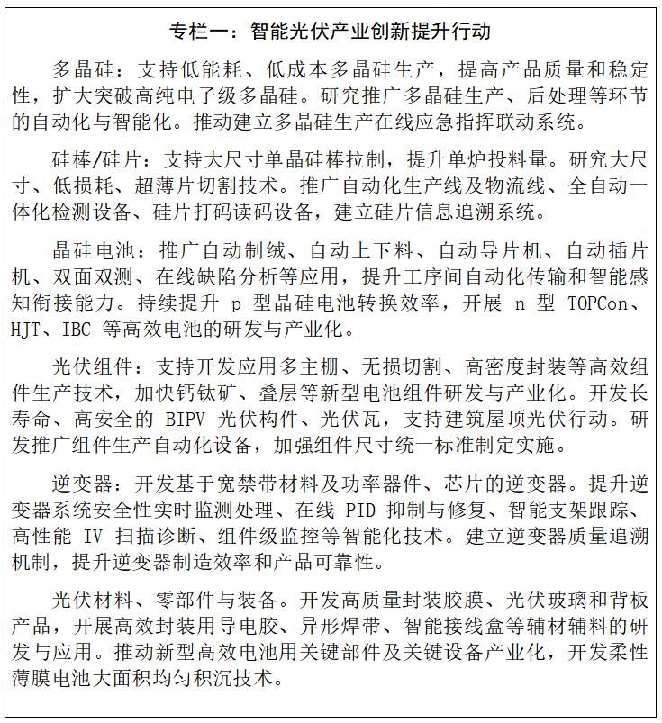 加快產(chǎn)業(yè)技術(shù)創(chuàng)新。推進智能光伏產(chǎn)業(yè)鏈技術(shù)創(chuàng)新,加快大尺寸硅片、高效太陽能電池及組件等研制和突破。夯實配套產(chǎn)業(yè)基礎(chǔ),推動智能光伏關(guān)鍵原輔料、設(shè)備、零部件等技術(shù)升級。開展智能光伏與建筑節(jié)能、交通運輸、綠色農(nóng)業(yè)等領(lǐng)域相結(jié)合的交叉技術(shù)研究。