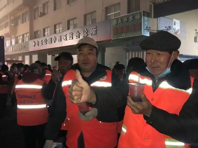 1月9日早上6時許,天色未亮,忙碌了一陣子的環(huán)衛(wèi)工人們就領到了濰坊壽光市志愿者們準備的熱乎乎的臘八粥。