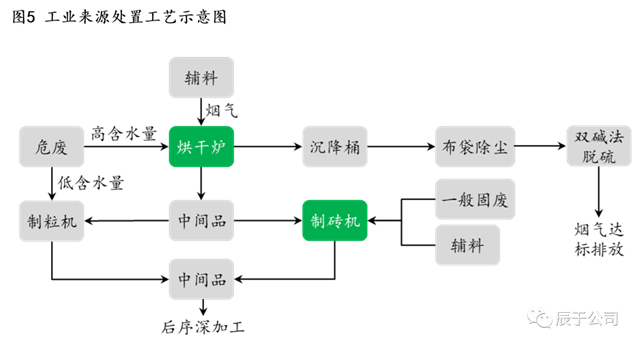 工業(yè)來(lái)源的再生有色金屬工藝相比復(fù)雜很多,一是原料種類繁多,有廢水、固廢等形態(tài);二是含量低且多數(shù)為有害物質(zhì),雖然也有含量高的生產(chǎn)邊角料,但大多是工業(yè)危廢,含量通常不高于5%。因此工業(yè)來(lái)源的處置工藝通常要根據(jù)具體的原料進(jìn)行處置,輔料、設(shè)備的投入更多,對(duì)企業(yè)的技術(shù)要求很高(見(jiàn)圖5)。