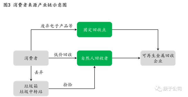 “消費(fèi)者來(lái)源”的回收產(chǎn)業(yè)鏈渠道相對(duì)較多且發(fā)達(dá),中間商的活動(dòng)也十分活躍,多為自然人采購(gòu),不穩(wěn)定因素多,回收原料主要為電子產(chǎn)品等含可回收金屬的家用電器(見(jiàn)圖3)。例如飛南資源早期采用的是自然人采購(gòu)這一特殊的采購(gòu)模式,依托專門從事廢銅回收的自然人,2017-2018年間,向自然人采購(gòu)占比超過(guò)四成。“消費(fèi)者來(lái)源”的回收率較高,基本上只要能值錢就會(huì)有人專門在收集、轉(zhuǎn)賣,更何況有色金屬單價(jià)高,廢銅的受歡迎程度比廢鐵要高得多。中國(guó)的易拉罐回收率超過(guò)99%也能夠說(shuō)明這一點(diǎn)。