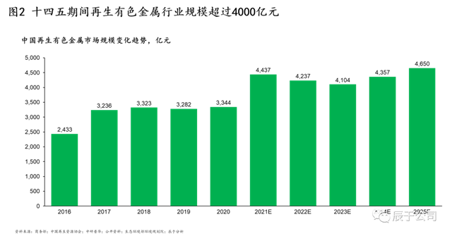 供給和需求的不平衡下,再生有色金屬作為重要的替代方式空間巨大。我國(guó)《“十四五”循環(huán)經(jīng)濟(jì)發(fā)展規(guī)劃》等政策對(duì)再生有色金屬寄予厚望,例如到2025年再生銅產(chǎn)量要達(dá)到400萬(wàn)噸,與2020年相比增長(zhǎng)23%,再生鋁產(chǎn)量要達(dá)到1500萬(wàn)噸,與2020年相比增長(zhǎng)55%。結(jié)合價(jià)格預(yù)測(cè),辰于認(rèn)為十四五期間再生有色金屬行業(yè)規(guī)模將處于4500億元左右,市場(chǎng)空間巨大(見(jiàn)圖2)。