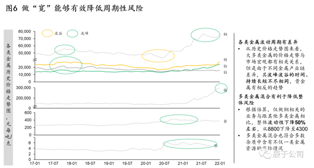 事實(shí)上,不同的有色金屬波動(dòng)周期會(huì)有差異,同時(shí)具備多種有色金屬處置的技術(shù)和生產(chǎn)線,也能夠幫助企業(yè)抵抗行業(yè)的周期性風(fēng)險(xiǎn),根據(jù)測(cè)算,做多種再生金屬與僅做再生銅相關(guān)的業(yè)務(wù)相比,整體價(jià)格波動(dòng)性能夠下降50%左右(見(jiàn)圖6)。