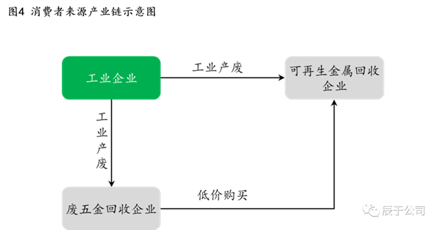 工業(yè)來(lái)源的回收渠道較少,中間商也不多,大多從產(chǎn)廢企業(yè)直接采購(gòu),回收原料主要為工業(yè)企業(yè)廢料(見(jiàn)圖4)。如屹通新材長(zhǎng)期采用直接向產(chǎn)廢企業(yè)采購(gòu)廢鎳、廢銅及廢鋼等原材料的模式,無(wú)中間商參與,來(lái)源較為穩(wěn)定,采購(gòu)價(jià)格參考市場(chǎng)價(jià)格,2017-2020年間,其和6家本地企業(yè)簽訂了23個(gè)1000萬(wàn)以上的大額原材料采購(gòu)合同。
