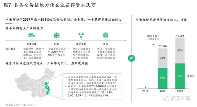 具備全價(jià)值鏈能力的企業(yè)也在資本市場(chǎng)有更高的競(jìng)爭(zhēng)力,在行業(yè)并購(gòu)案中,由于企業(yè)具備全價(jià)值鏈能力而得到高溢價(jià)收購(gòu)的案例不在少數(shù),例如中金環(huán)境于2017年底以815%的溢價(jià)收購(gòu)浙江金泰萊(見(jiàn)圖7)。