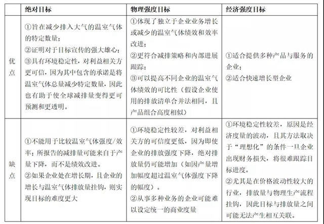 《指引》指出為實現凈零排放,企業(yè)必須根據絕對排放量設定目標進行溫室氣體排放量絕對減排,而對企業(yè)內部采用物理強度或經濟強度目標。需要注意的是,絕對目標無法比較同類企業(yè)的溫室氣體排放強度,且無法跟蹤效率改進情況,因為企業(yè)報告的減排量可能來自產量下降,而不是來自其績效的改進,如果企業(yè)處在增長期,且企業(yè)的增長與溫室氣體排放量掛鉤,則實現目標的難度更大。強度目標不一定會減少絕對排放量,因為即使企業(yè)的單位排放效率高,企業(yè)經營產量增加可能導致絕對排放量增加。