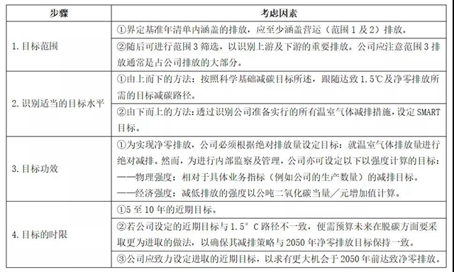 為了保證能實現其凈零排放目標,企業(yè)可基于自身目前的減排潛力設定一個減排“小目標”——SMART目標,以確保企業(yè)能逐步過渡到科學基礎減排目標。SMART目標須是具體的(Specific)、可計量的(Measurable)、可行的(Attainable)、與業(yè)務相關的(Relevant)、具有時限性的(Time bound)。企業(yè)可采用較為容易實踐的措施,如選擇獲得綠色認證的節(jié)能辦公室、將低碳準則納入采購規(guī)章等實現SMART目標。在較易實踐的措施上取得成功后,將建立起公司管理層及員工科學降碳的信心,使其愿意采取深度脫碳行動以實現科學基礎減碳目標。企業(yè)制定減碳目標的步驟可見下表。