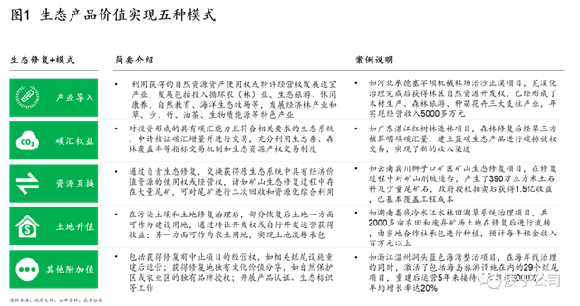 從以往案例來看,生態(tài)產(chǎn)品價(jià)值實(shí)現(xiàn)的路徑往往是以“生態(tài)修復(fù)+XXXX”的模式,具體包括“+產(chǎn)業(yè)導(dǎo)入”、“+碳匯權(quán)益”、“+資源互換”、“+土地升值”和“+其他附加值”五類(見圖1)。