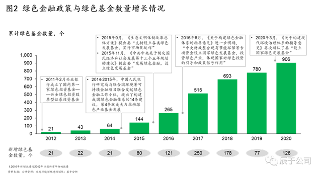 綠色金融是近年來行業(yè)發(fā)展的熱詞,包括綠色基金、綠色信貸、綠色債券、綠色保險(xiǎn)等多種金融工具。以綠色基金為例,十三五期間先后發(fā)布了多個(gè)政策推動(dòng)綠色產(chǎn)業(yè)基金發(fā)展,全國綠色基金的數(shù)量也增加了762個(gè)(見圖2)。其中2020年揭牌成立的國家綠色發(fā)展基金是生態(tài)環(huán)境保護(hù)領(lǐng)域第一個(gè)國家級(jí)政府投資基金,被認(rèn)為是生態(tài)環(huán)境保護(hù)投融資機(jī)制改革取得歷史性突破和進(jìn)展的標(biāo)志。
