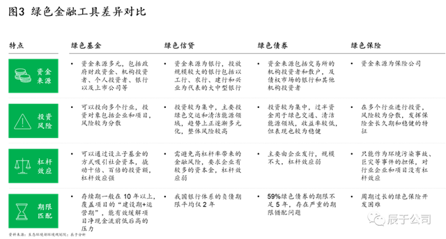 不同的綠色金融工具在資金來源、投資風(fēng)險(xiǎn)、杠桿效應(yīng)、期限匹配等方面都有所差異(見圖3),在實(shí)際項(xiàng)目運(yùn)用中,可根據(jù)項(xiàng)目實(shí)際情況靈活運(yùn)用,最大限度的降低資金成本。