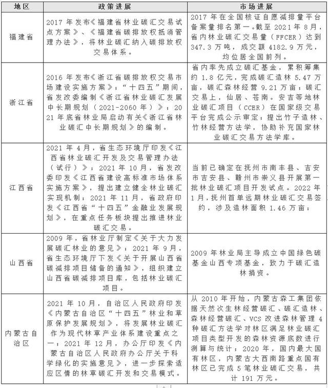 地方上,我國于2004年便啟動林業(yè)碳匯項目試點,在江西、福建、浙江、內(nèi)蒙古、遼寧等省份開展了項目的實踐落地。一方面,各省市利用既有方法學(xué)進(jìn)行本地林業(yè)碳匯資源本底調(diào)查;另一方面,基于自身林業(yè)資源優(yōu)勢,各試點紛紛開展碳匯項目的政策性研究和市場布局。如下表所示,以林草資源豐富的福建、浙江、內(nèi)蒙古等省份為首,在全國核證自愿減排市場暫時停止交易的時段里持續(xù)開展碳匯項目方法學(xué)的研究以及地方市場建設(shè),為未來全國性林業(yè)碳匯交易融通打下堅實基礎(chǔ)。