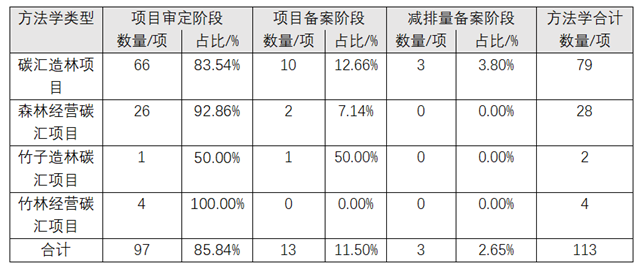 根據(jù)相關(guān)研究統(tǒng)計,整體上,在CCER市場尚未暫停的時段里,全國總計有97個項目進(jìn)入項目審定階段,13個項目進(jìn)入備案階段,3個項目實現(xiàn)減排量備案;在碳匯項目方法學(xué)統(tǒng)計中,碳匯造林項目方法學(xué)占比最高,其進(jìn)入審定階段的項目量亦居首。