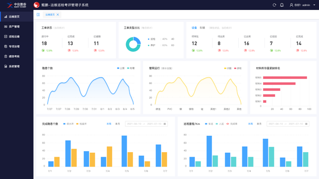 系統(tǒng)首頁:數(shù)據(jù)可視化匯總平臺,快速準(zhǔn)確查看項目中的各信息模塊部分。同時,各種形式的統(tǒng)計圖表直觀反映管網(wǎng)的真實信息。