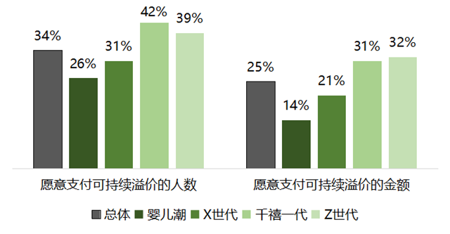 調(diào)查結(jié)果發(fā)現(xiàn),總體而言,34%的消費者愿意為可持續(xù)產(chǎn)品支付溢價,平均愿意支付的溢價比例為25%。同時,各年齡段存在支付意愿的顯著差異,年輕人支付意愿相對更高。“嬰兒潮一代”僅26%愿意支付14%的溢價,“X世代”則有31%愿意支付21%的溢價,“千禧一代”與“Z世代”則有近40%愿意支付約三分之一的溢價。