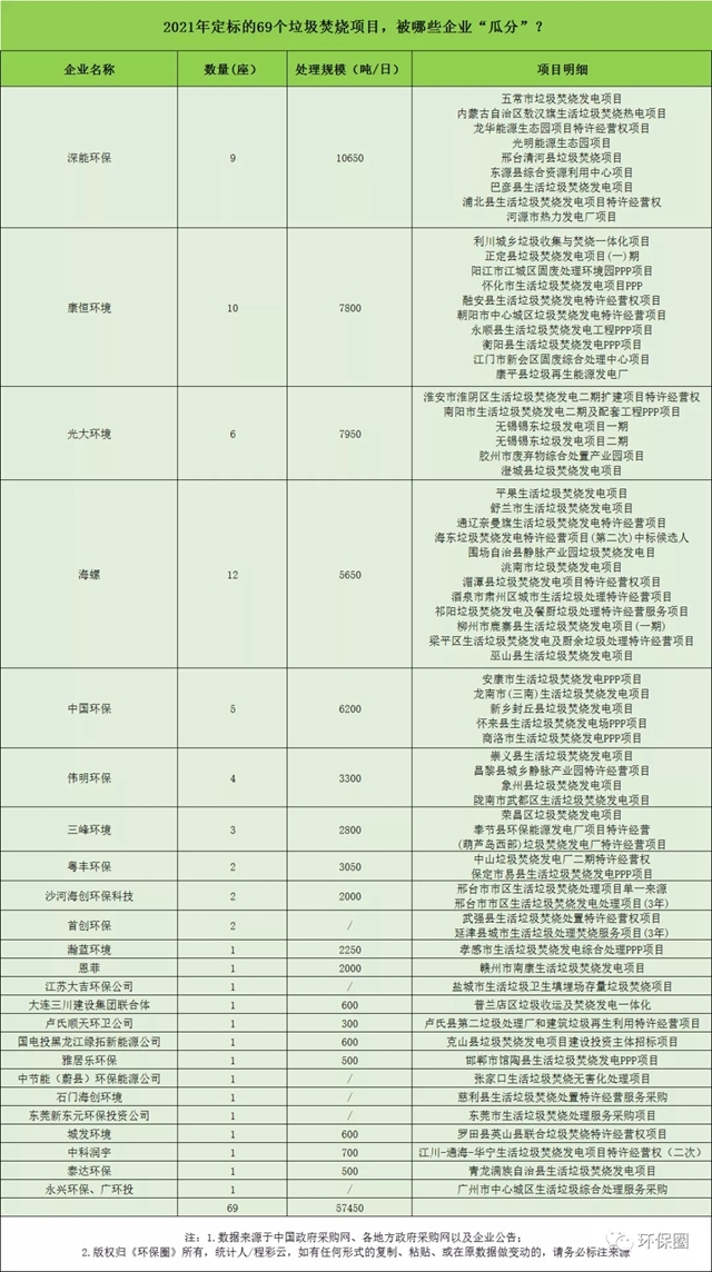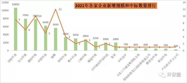 最后,我們從中標(biāo)企業(yè)的角度,進(jìn)一步觀察2021年定標(biāo)的垃圾焚燒項目,被哪些企業(yè)“瓜分”了,這也是每年讀者最感興趣的話題。