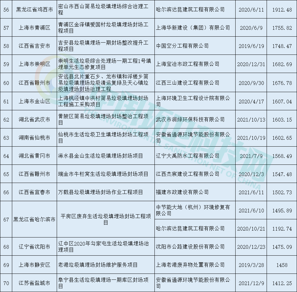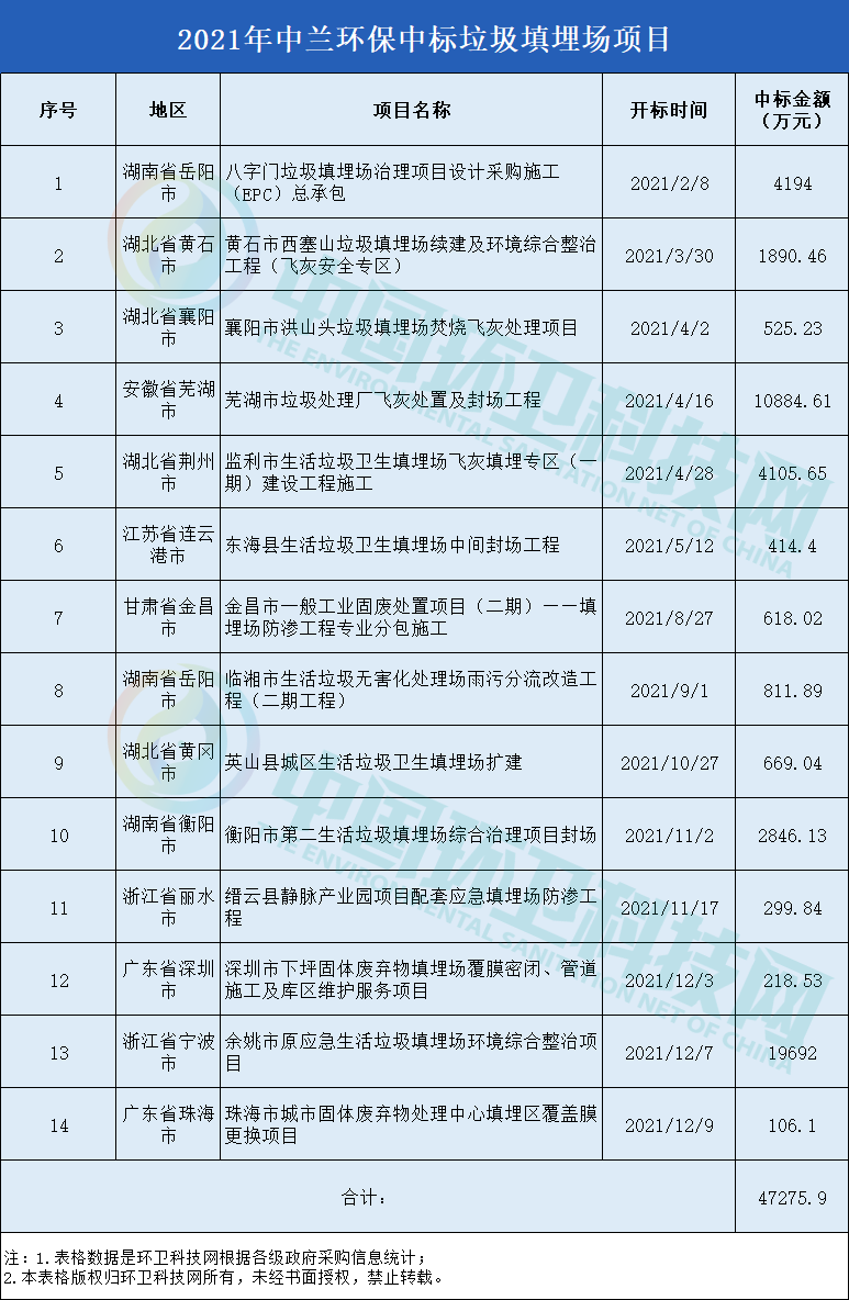 據(jù)環(huán)衛(wèi)科技網(wǎng)統(tǒng)計,2021年,中蘭環(huán)保累計中標了14個垃圾填埋場項目,合計金額達4.73億元。其中上千萬級項目有6個,包括2個億元級項目——余姚市原應急生活垃圾填埋場環(huán)境綜合整治項目和蕪湖市垃圾處理廠飛灰處置及封場工程。項目匯總表如下圖。