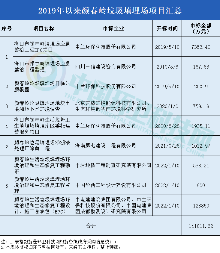 據(jù)環(huán)衛(wèi)科技網(wǎng)統(tǒng)計,2019年以來,顏春嶺垃圾填埋場就有6個環(huán)境治理相關(guān)項目開標,包括日臨時膜覆蓋、地塊土壤和地下水環(huán)境調(diào)查、填埋庫區(qū)委托運營服務、滲濾液處理廠除臭工程以及環(huán)境治理和生態(tài)修復工程,合計投入達到14.18億元。總投資近13億元的顏春嶺生活垃圾填埋場環(huán)境治理和生態(tài)修復工程更是迄今為止國內(nèi)金額最高的項目!