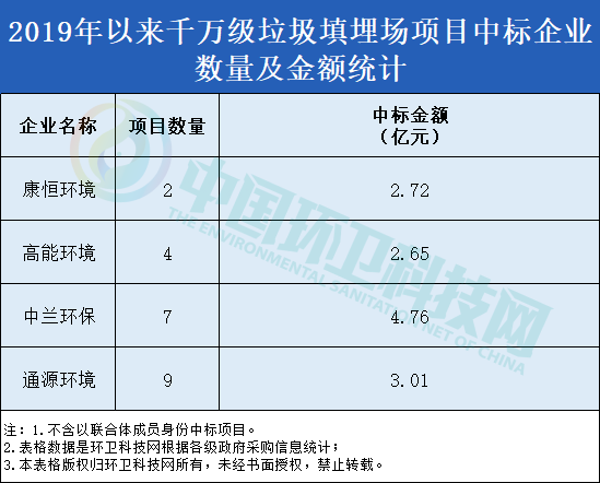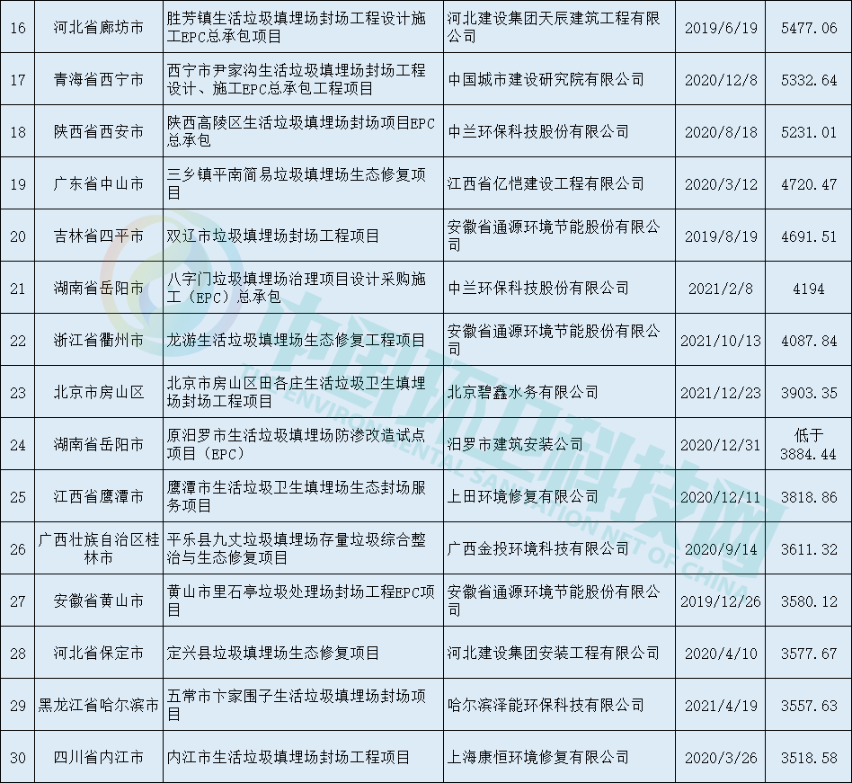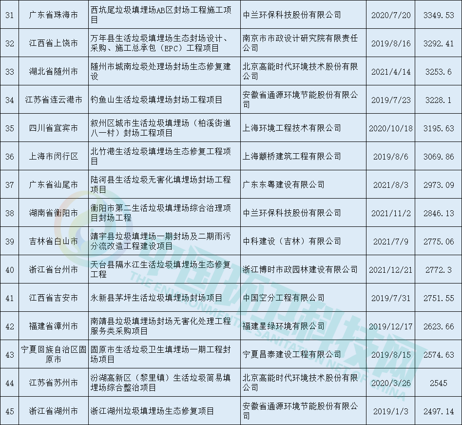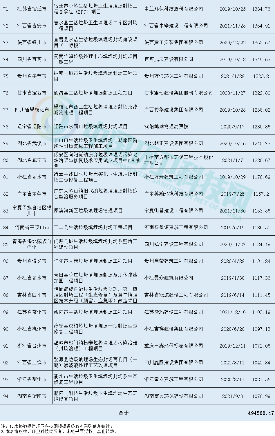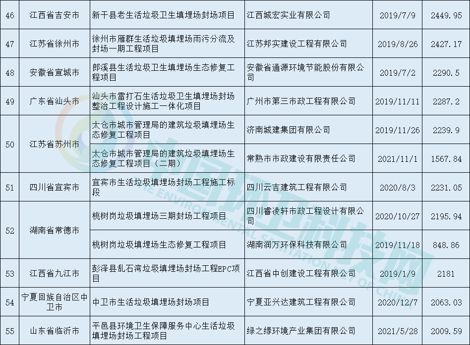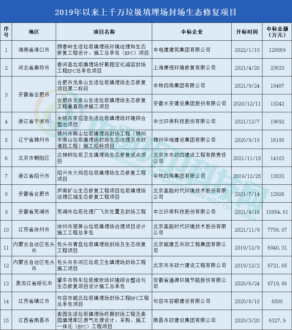 據(jù)環(huán)衛(wèi)科技網(wǎng)統(tǒng)計,2019年以來,全國共開標94個千萬級垃圾填埋場封場和生態(tài)修復工程項目,合計中標金額超過49億元,其中億元級以上項目有9個。(具體統(tǒng)計表見文末)
