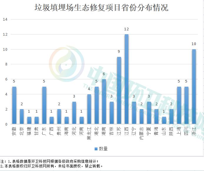 從省份分布來看,江西省開標項目數(shù)量最多,共12個垃圾填埋場生態(tài)修復工程,遠超其他省份。2020年以來,江西省生活垃圾分類工作堅持立法引領(lǐng),以國家試點帶動其他地區(qū)的垃圾分類工作,堅持抓好垃圾分類設(shè)施建設(shè),到2020年底,該省11個設(shè)區(qū)市全部建成生活垃圾焚燒廠;除已完成南昌、宜春市生活垃圾分類國家試點任務外,其余設(shè)區(qū)市和53個省生態(tài)文明示范縣(市、區(qū))已全部啟動垃圾分類工作,城區(qū)原生生活垃圾處理基本實現(xiàn)“零填埋”;2021年,該省新增生活垃圾焚燒日處理能力5000噸、廚余垃圾日處理能力500噸,年底城鎮(zhèn)原生生活垃圾基本實現(xiàn)“零填埋”。