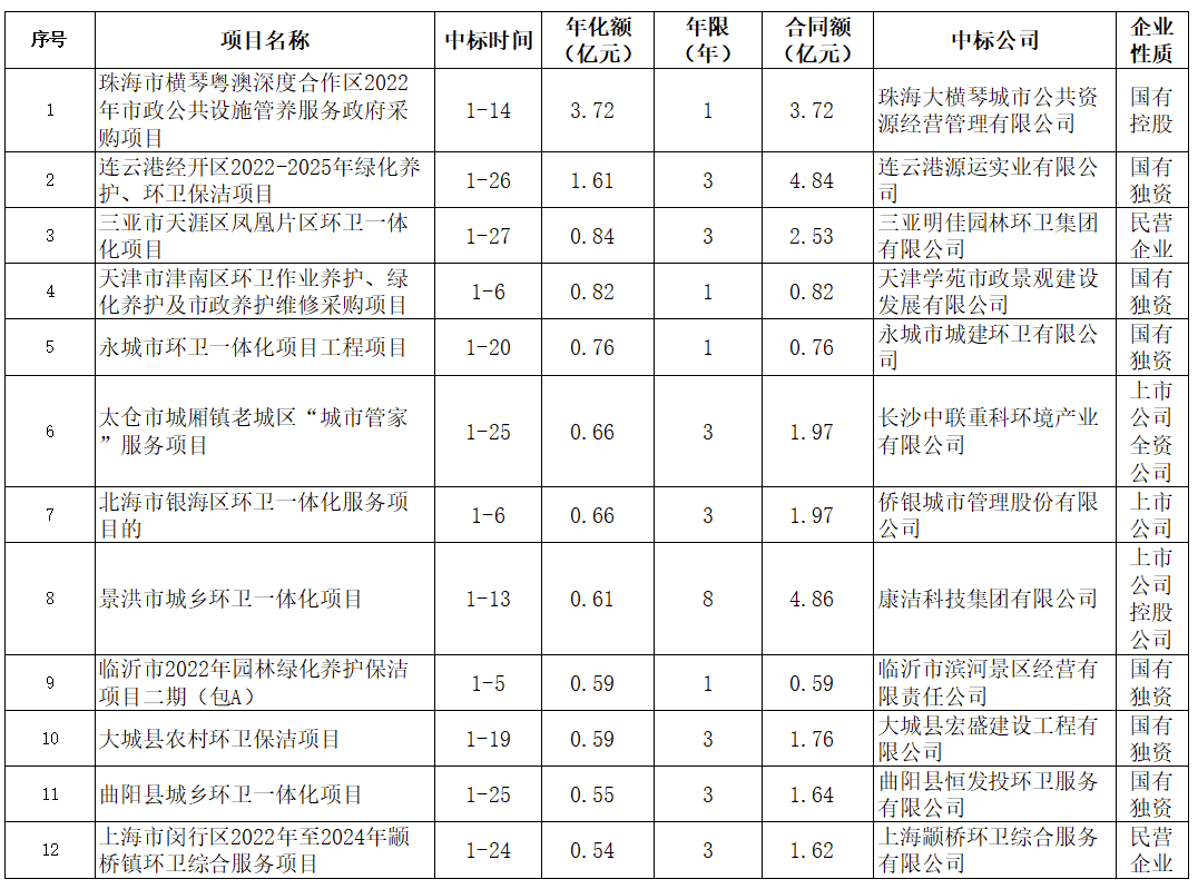 在1月份已開標(biāo)的12個(gè)年化額5000萬+環(huán)衛(wèi)服務(wù)項(xiàng)目中,上市公司(及控股企業(yè))中標(biāo)3個(gè),民營(yíng)企業(yè)中標(biāo)2個(gè),占比分別為25%和17%。