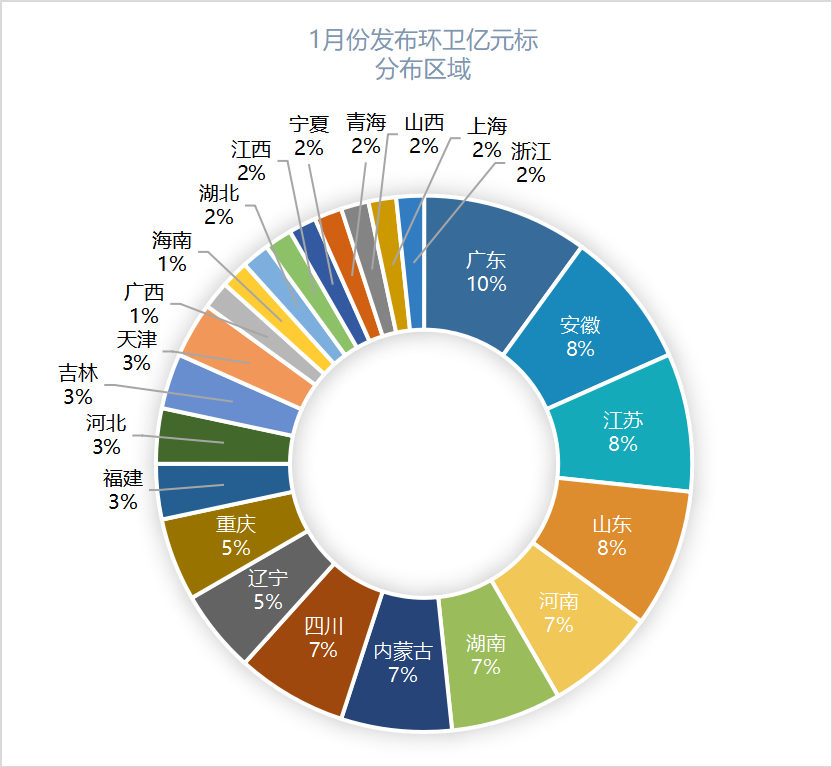 1月份已發(fā)布的60個環(huán)衛(wèi)億元標(biāo)分布于23個省份,其中廣東、安徽、江蘇、山東、河南、湖南、內(nèi)蒙古、四川發(fā)布項目37個,占比超過60%。