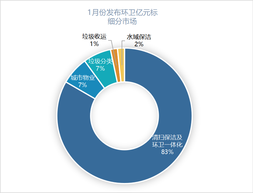 1月份已發(fā)布的60個環(huán)衛(wèi)億元標(biāo)涉及“清掃保潔及環(huán)衛(wèi)一體化、城市物業(yè)、垃圾分類、垃圾收運、及水域保潔”等五個細(xì)分市場。
