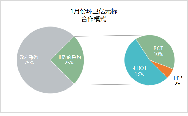 1月份已發(fā)布的60個環(huán)衛(wèi)億元標(biāo),其中采取政府采購模式的項目有45個,采取非政府采購模式的為15個,非政府采購項目占比25%。