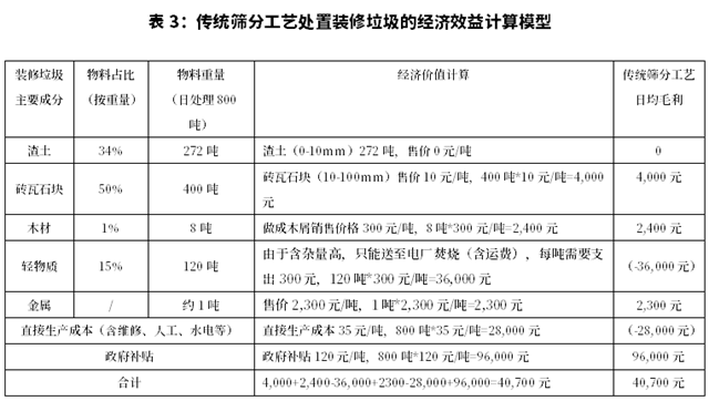 2.1采用傳統(tǒng)篩分工藝處置800噸裝修垃圾所產(chǎn)生的日均經(jīng)濟(jì)效益