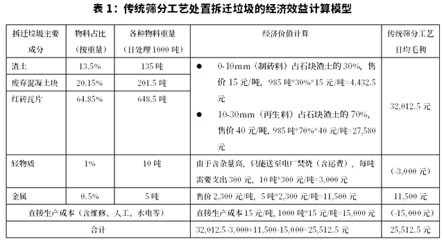 1.1采用傳統(tǒng)篩分工藝處置1000噸拆遷垃圾所產(chǎn)生的日均經(jīng)濟(jì)效益