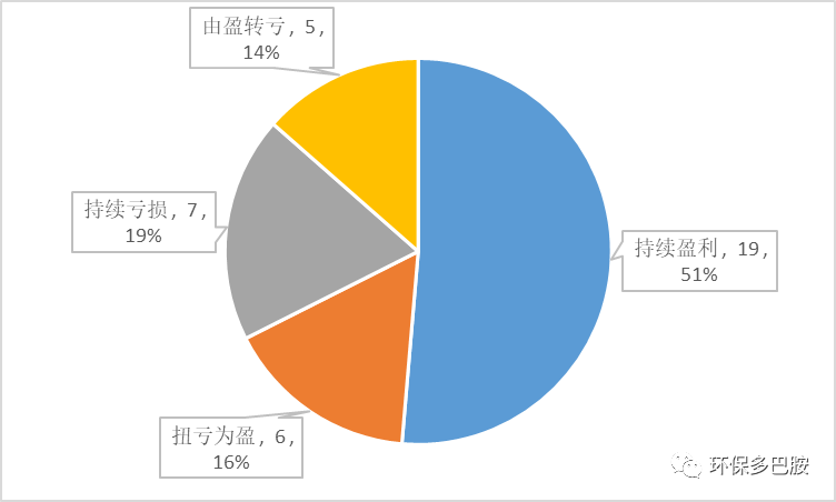 總的來(lái)看,總計(jì)37家上市公司提前交卷,其中持續(xù)盈利19家,扭虧為盈6家,持續(xù)虧損7家,由盈轉(zhuǎn)虧5家。按照160家環(huán)保上市公司樣本數(shù)量統(tǒng)計(jì),