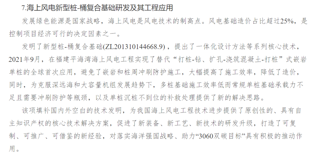 日前,華東院海上風電“新型樁-桶復合基礎(chǔ)研發(fā)及其工程應(yīng)用”入選2021年度中國十大海洋科技進展。這項由華東院發(fā)明并創(chuàng)新設(shè)計的核心技術(shù),不僅大幅提高了海上施工作業(yè)效率,也為破解海上風電走向深遠海、大機組過程中常規(guī)單樁基礎(chǔ)承載力不足等難題,提供可復制、可推廣、可借鑒的經(jīng)驗與思路,為國家海洋技術(shù)領(lǐng)域發(fā)展、助力“3060雙碳目標”,發(fā)揮積極作用。
