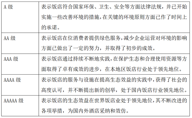 我國于2007年發(fā)布了《綠色飯店等級評定規(guī)定》,根據(jù)企業(yè)在提供綠色服務(wù)、保護環(huán)境等方面做出的努力將綠色酒店分為五個等級,具體內(nèi)容如下。