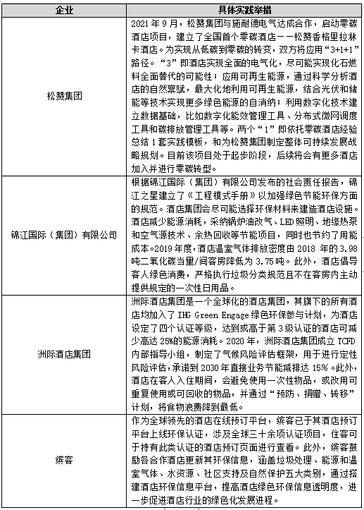 企業(yè)層面,在綠色、減碳的大背景下,國內(nèi)外酒店企業(yè)都進行了積極實踐,從酒店治理、技術(shù)創(chuàng)新、能源結(jié)構(gòu)調(diào)整、材料選擇、宣傳推廣等多個維度采取了各種措施以達(dá)到節(jié)能減排、綠色低碳發(fā)展的效果。此外,酒店企業(yè)也逐漸注重對員工的綠色環(huán)保培訓(xùn),進而通過宣傳推廣傳導(dǎo)到酒店住客端,讓住客體會到整個酒店的綠色服務(wù)從而進一步樹立綠色消費的理念。