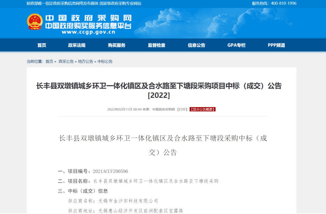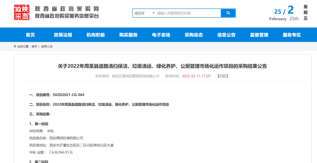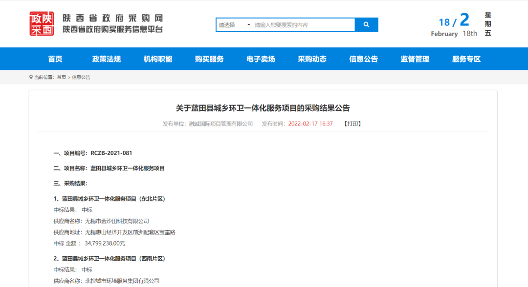 金沙田六天接連斬獲3個環(huán)衛(wèi)項目,總金額達4.41億元!                                        來源 | 環(huán)衛(wèi)科技網(wǎng)環(huán)衛(wèi)科技網(wǎng)訊,金沙田六天接連斬獲3個環(huán)衛(wèi)項目,總金額達4.41億元!藍田縣城鄉(xiāng)環(huán)衛(wèi)一體化服務(wù)項目2月17日,陜西省政府采購網(wǎng)發(fā)布藍田縣城鄉(xiāng)環(huán)衛(wèi)一體化服務(wù)項目的采購結(jié)果公告。金沙田中標藍田縣城鄉(xiāng)環(huán)衛(wèi)一體化服務(wù)項目(東北片區(qū))標段,中標金額總計約3.48億元,特許經(jīng)營期10年,其中包括1年建設(shè)期。該標段范圍覆蓋藍關(guān)街道辦(北環(huán)路以北部分)、三里鎮(zhèn)區(qū)、華胥鎮(zhèn)區(qū)及洩湖鎮(zhèn)區(qū)(包含藍田縣工業(yè)園、西北家具工業(yè)園)。未來,金沙田科技將負責提供城區(qū)道路清掃保潔、垃圾收轉(zhuǎn)運、公廁和文明驛站運營、綠化養(yǎng)護、垃圾分類、環(huán)衛(wèi)智慧平臺等環(huán)衛(wèi)服務(wù)。周至縣道路清掃保潔、垃圾清運、綠化養(yǎng)護、公廁管理市場化運作項目2月11日,陜西省政府采購網(wǎng)發(fā)布周至縣道路清掃保潔、垃圾清運、綠化養(yǎng)護、公廁管理市場化運作項目采購結(jié)果公告,第二標段中標方為金沙田,中標金額為460.5萬元,服務(wù)期限1年。長豐縣雙墩鎮(zhèn)城鄉(xiāng)環(huán)衛(wèi)一體化鎮(zhèn)區(qū)及合水路至下塘段采購項目2月11日,中國政府采購網(wǎng)發(fā)布長豐縣雙墩鎮(zhèn)城鄉(xiāng)環(huán)衛(wèi)一體化鎮(zhèn)區(qū)及合水路至下塘段采購項目中標(成交)公告,中標方為金沙田,中標金額為8792.5萬元,服務(wù)期限1年,合同1年1簽,續(xù)簽不超過2年。1、雙墩鎮(zhèn)鎮(zhèn)區(qū)范圍內(nèi)的市政道路、重要道路及道路兩側(cè)的清掃保潔;2、雙墩鎮(zhèn)鎮(zhèn)區(qū)范圍內(nèi)街道、公園、游園、廣場等衛(wèi)生保潔;3、本次招標范圍內(nèi)所有生活垃圾收集、轉(zhuǎn)運至陶樓合肥長豐皖能環(huán)保電力有限公司;4、雙墩鎮(zhèn)鎮(zhèn)區(qū)范圍內(nèi)繁華商業(yè)區(qū)、人群密集街道及主要交通道路路口文明勸導(dǎo)服務(wù);6、建立智慧環(huán)衛(wèi)信息管理系統(tǒng)平臺。接下來的3月份,金沙田又將會有哪些亮眼表現(xiàn)?來源 | 環(huán)衛(wèi)科技網(wǎng)