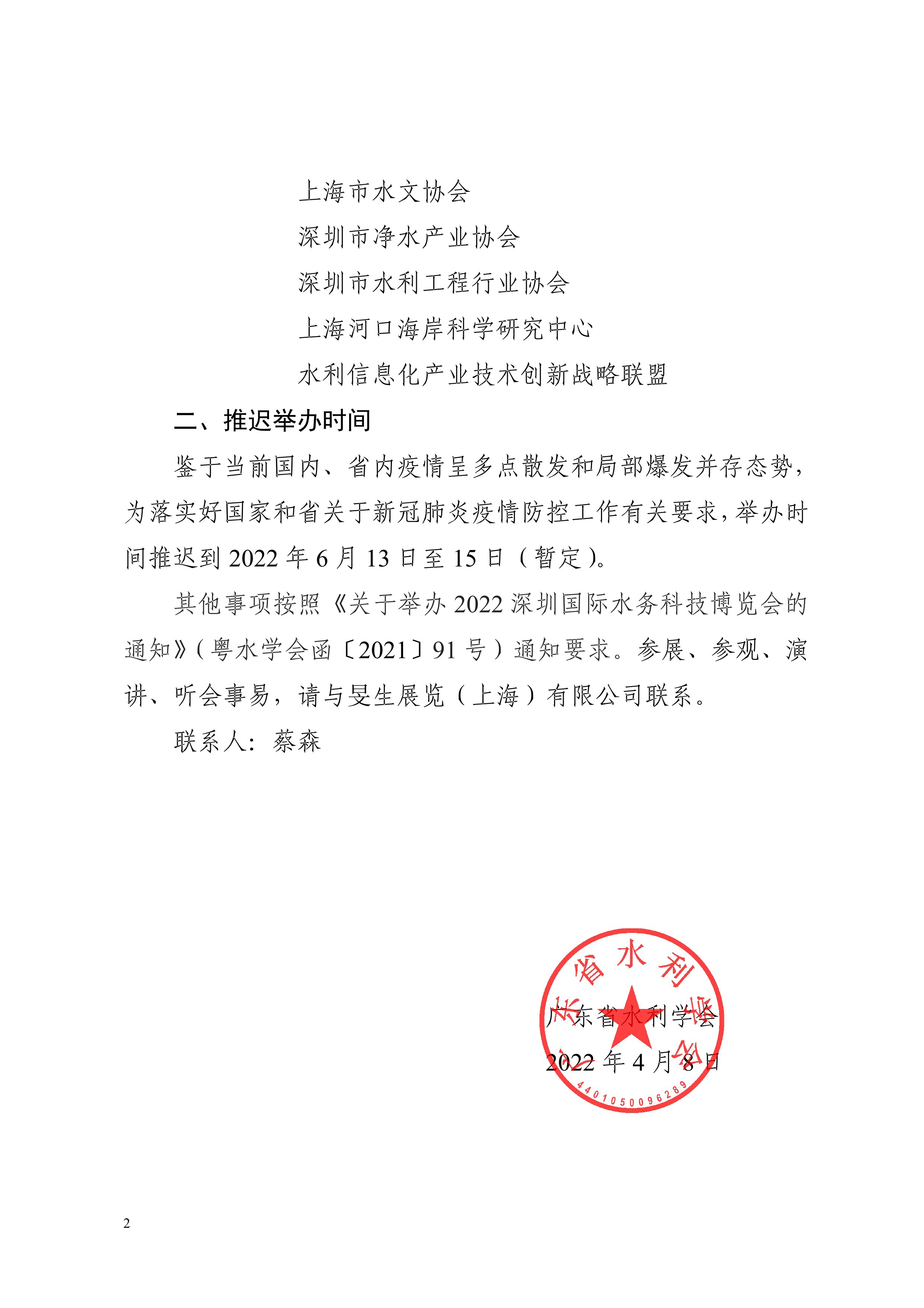 由我會(huì)與廣東省水利水電技術(shù)中心、深圳市水務(wù)學(xué)會(huì)共同主辦、旻生展覽(上海)有限公司承辦的“2022深圳國(guó)際水務(wù)科技博覽會(huì)”,原定于2022年4月20日至22日舉行。為進(jìn)一步做好組織發(fā)動(dòng)和新冠肺炎疫情防控工作,有關(guān)事項(xiàng)補(bǔ)充通知如下: