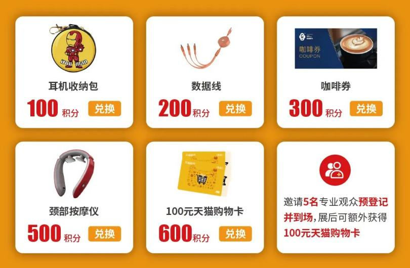 注:積分可在展會(huì)現(xiàn)場(chǎng)兌換天貓購(gòu)物卡、頸部按摩儀、咖啡券、收納包等精美禮品。