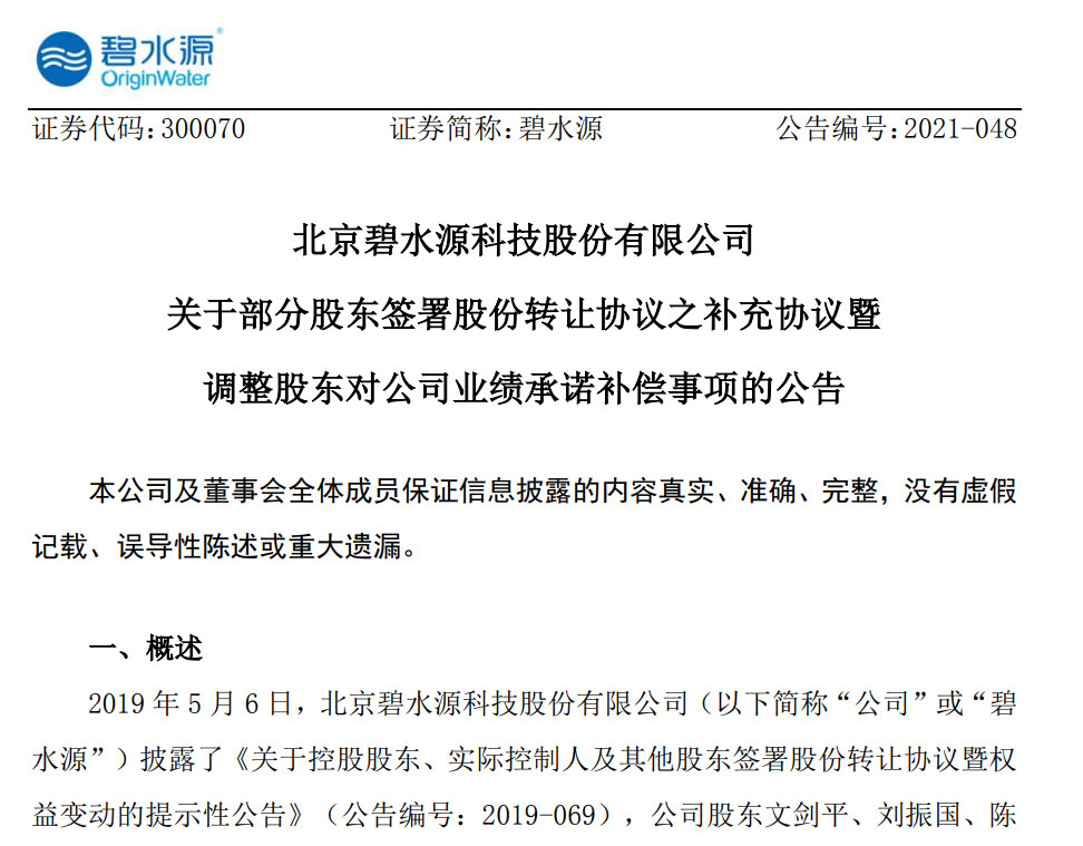 6、《關(guān)于部分股東簽署股份轉(zhuǎn)讓協(xié)議之補充協(xié)議暨調(diào)整股東對公司業(yè)績承諾事項的公告》,碧水源,2021-03-31