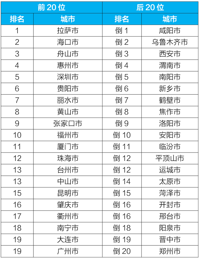 4月,168個(gè)重點(diǎn)城市中,??凇⒗_和舟山市等20個(gè)城市空氣質(zhì)量相對(duì)較好(從第1名至第20名);鶴壁、保定和新鄉(xiāng)市等20個(gè)城市空氣質(zhì)量相對(duì)較差(從倒數(shù)第1名至并列倒數(shù)第19名),見附表1。