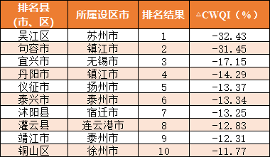 地表水環(huán)境質(zhì)量改善幅度相對(duì)較快的前10位(1—10名)依次是:吳江區(qū)、句容市、宜興市、丹陽(yáng)市、儀征市、泰興市、沭陽(yáng)縣、灌云縣、靖江市、銅山區(qū);