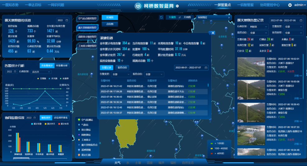 柯橋區(qū)整合6個區(qū)級部門、16個鎮(zhèn)街的120個高位監(jiān)控,覆蓋國控站點、高速高鐵、工業(yè)園區(qū)、平原山林、礦山工地等重點區(qū)域,共700余個多發(fā)預(yù)置監(jiān)測點統(tǒng)一納入平臺,實行24小時自動巡航監(jiān)管,對點位周邊3-5平方公里范圍內(nèi)的露天焚燒實現(xiàn)自動分析與抓拍。結(jié)合全區(qū)800余名網(wǎng)格員常態(tài)化巡查,實現(xiàn)“智防”+“人防”,做到露天焚燒行為精準發(fā)現(xiàn)、快速處置。實現(xiàn)告警信息秒級推送、“遠中近”三圖精準識別、“年月周日”分時段科學(xué)分析。