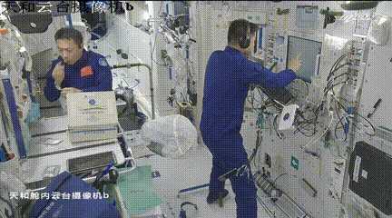 航天員蔡旭哲進(jìn)食后將食品包裝袋收好