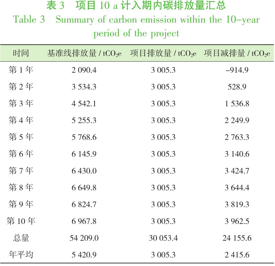 由CCER方法學計算可得,10 a計入期內(nèi)項目平均每年基準線排放量為5420.9 tCO2e,總項目排放量為3005.3 tCO2e,總減排量為2415.6 tCO2e。計算得出10 a計入期內(nèi)的項目碳排放量如表3所示。計入期內(nèi)單位垃圾采用焚燒方式處理后的基準線排放量為0.53 tCO2e/t,項目碳排放量約為0.29 tCO2e/t,碳減排量0.24 tCO2e/t。